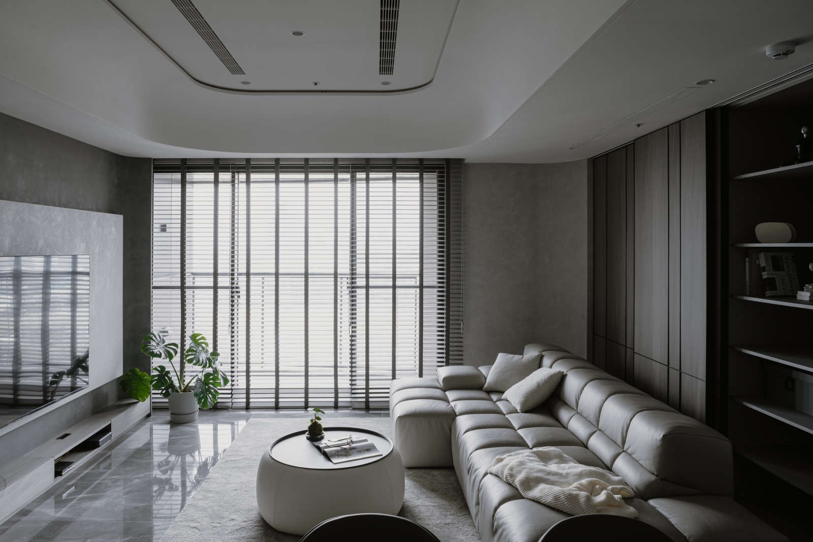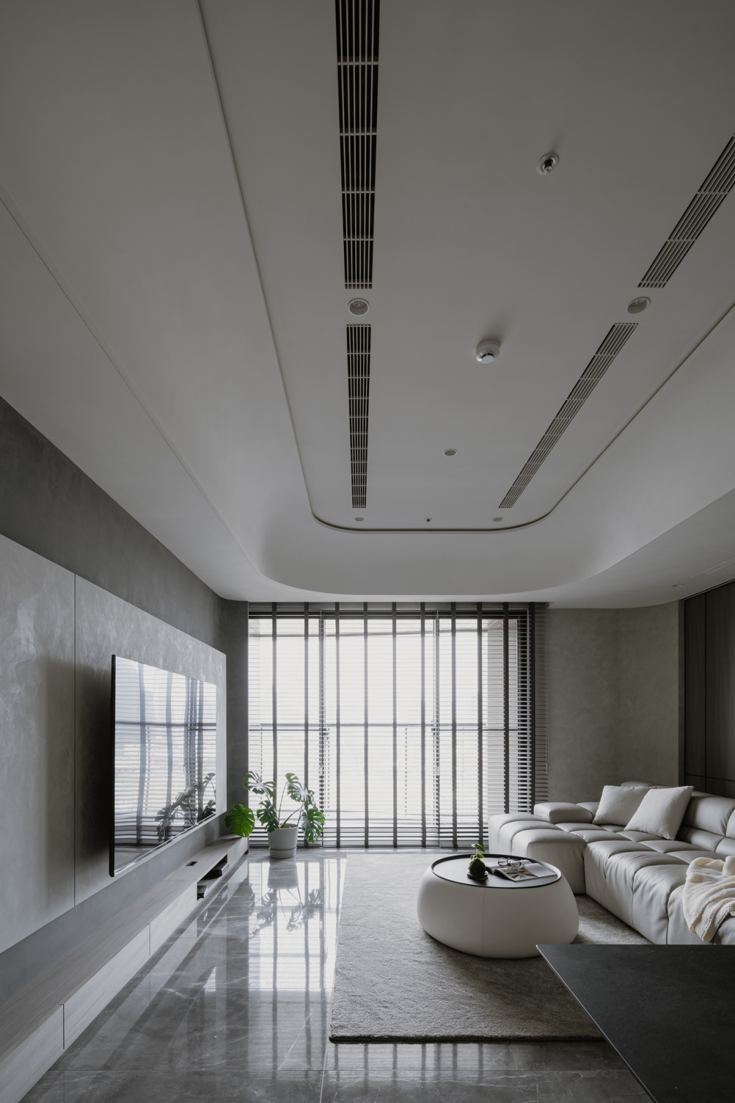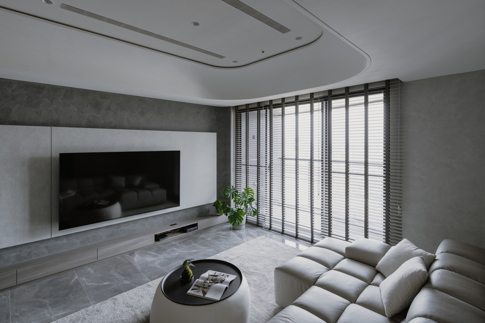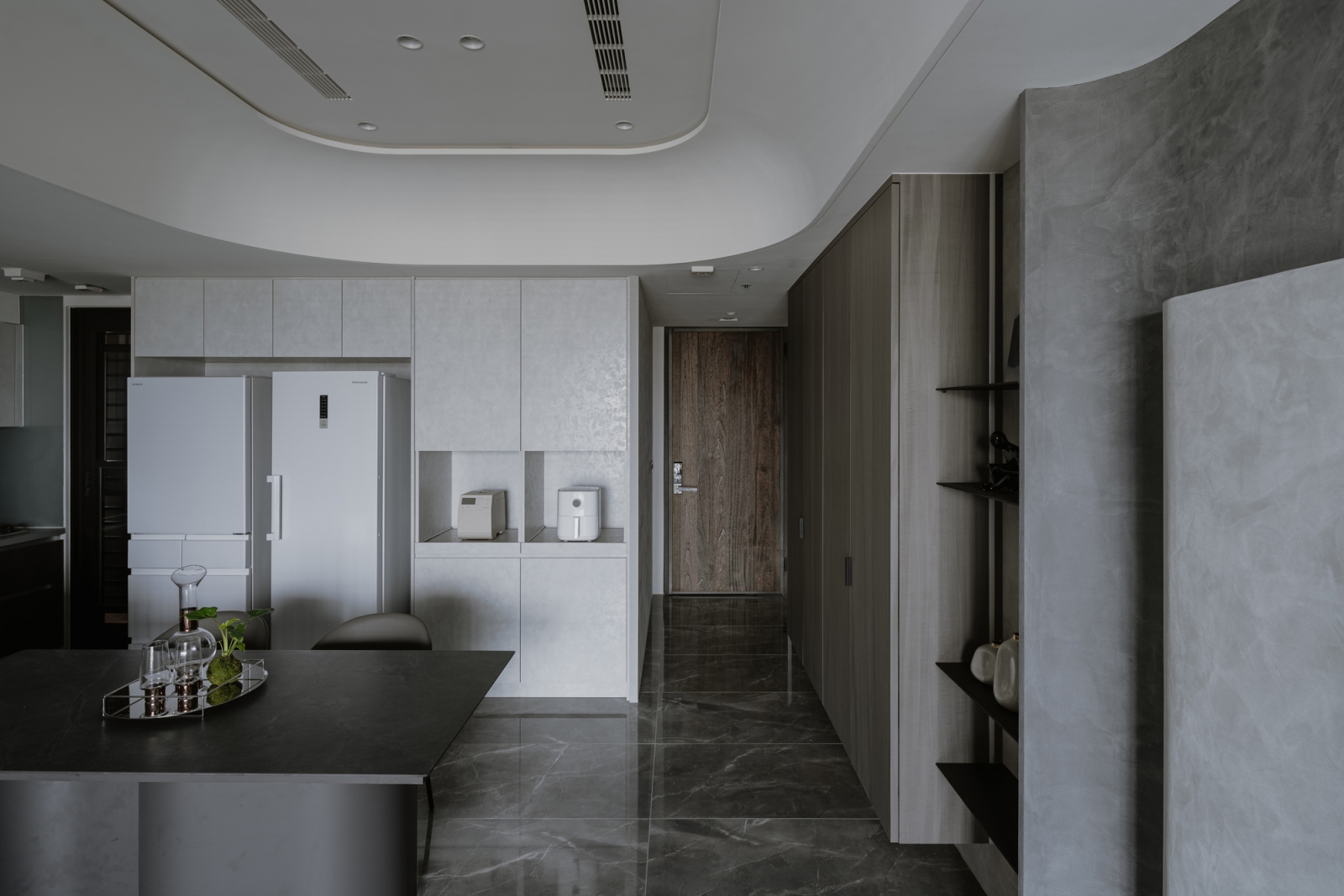 而整體空間風格以現代舒適為主,因原先在客變階段的選材,皆為灰白色系,因此在空間氣氛的營造,以大面淺色的特殊塗料為基底,搭配局部木皮櫃體增加空間的溫潤感,讓全家能聚集在一個放鬆舒適的空間內。