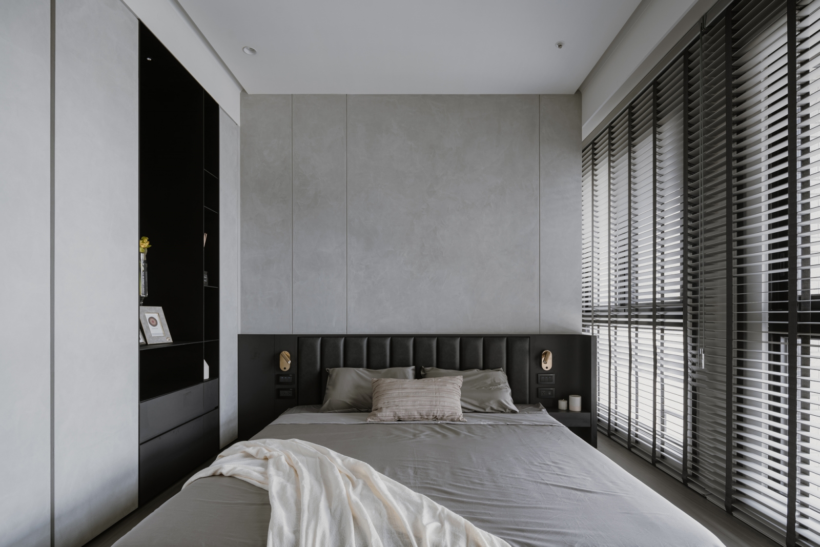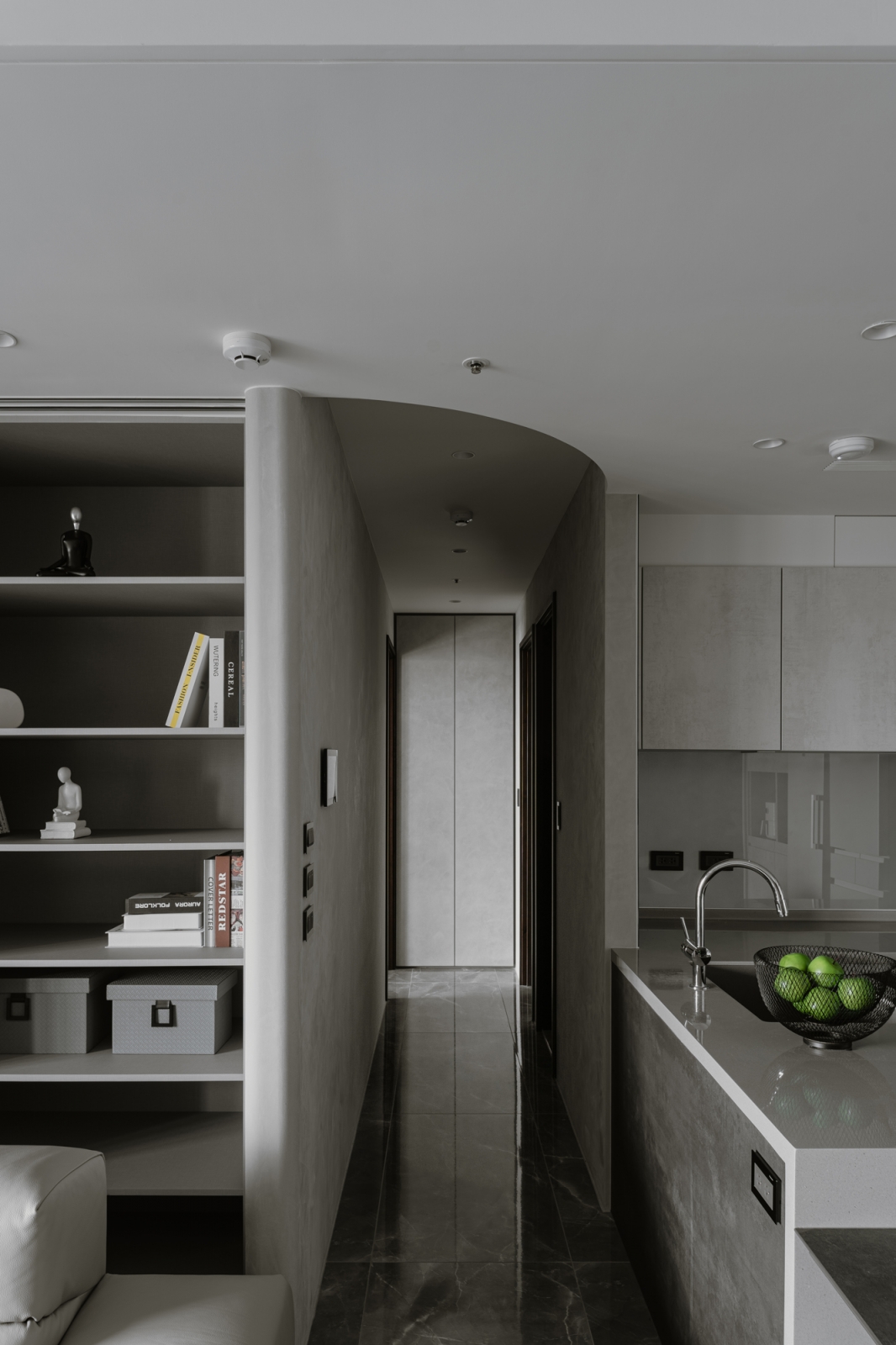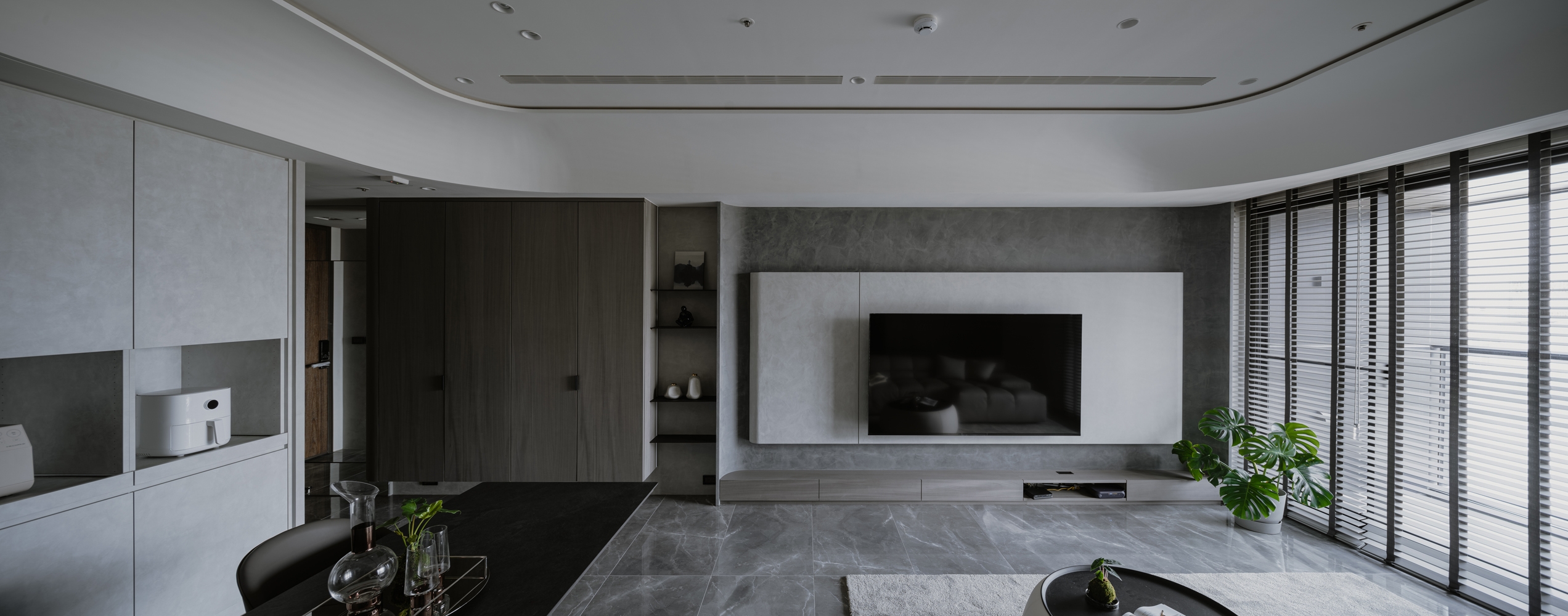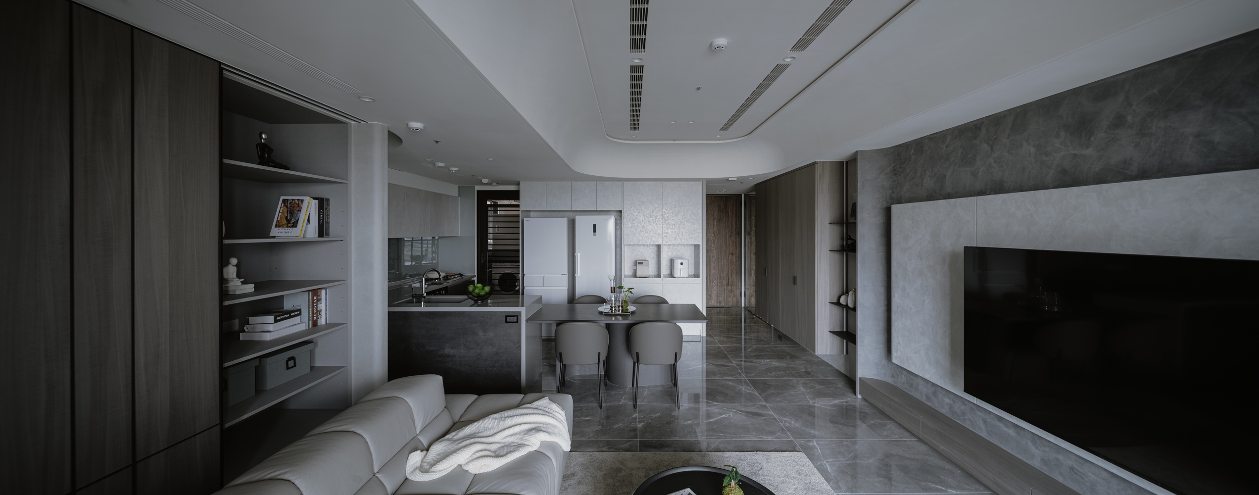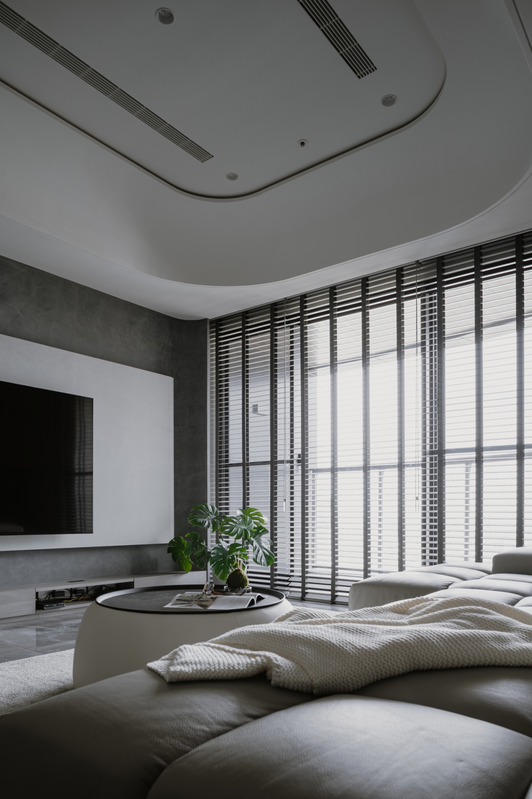 而整體空間風格以現代舒適為主,因原先在客變階段的選材,皆為灰白色系,因此在空間氣氛的營造,以大面淺色的特殊塗料為基底,搭配局部木皮櫃體增加空間的溫潤感,讓全家能聚集在一個放鬆舒適的空間內。