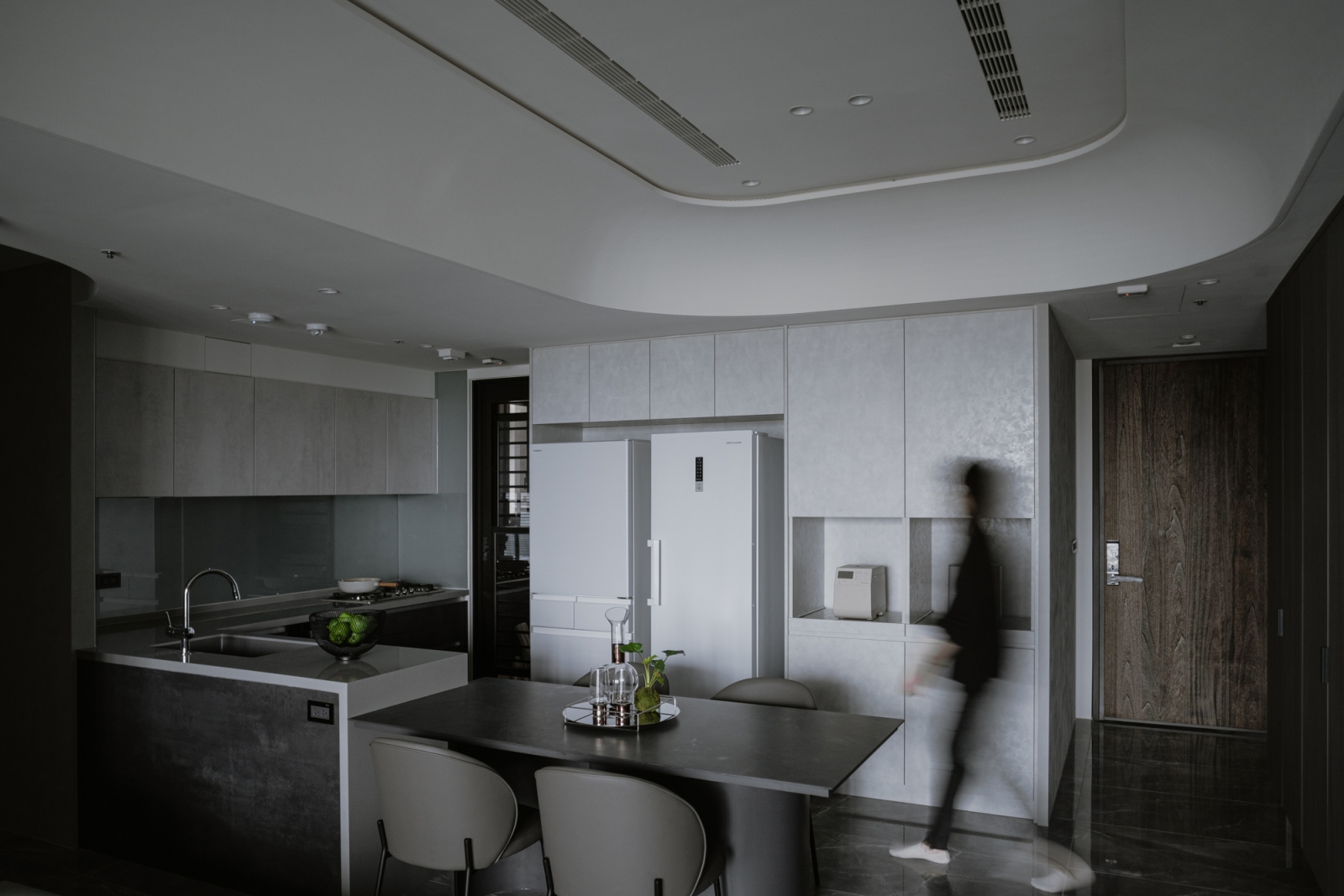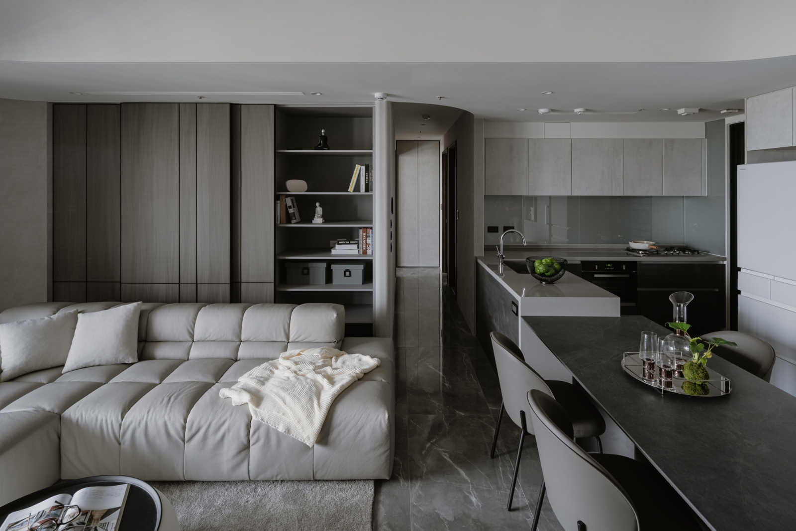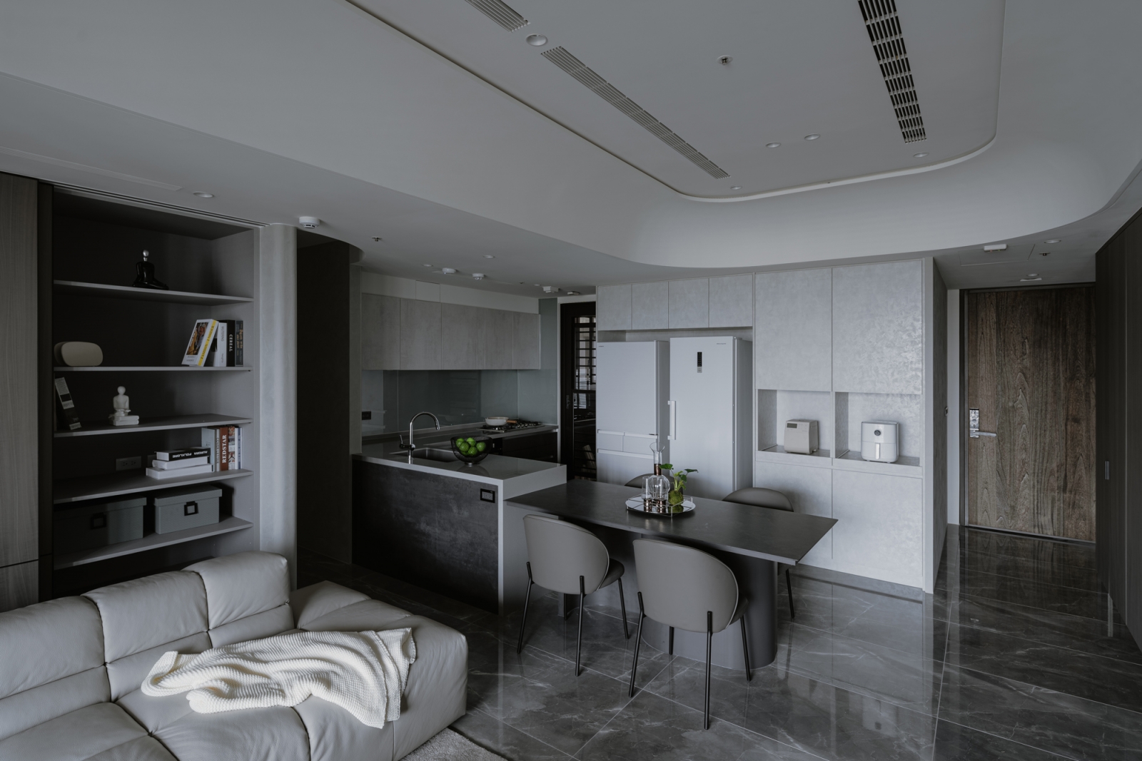 家中成員以客餐廳為生活交流的重心區域,因此將客廳區拉大,成為空間最主要的區域,平時喜愛於餐桌上一同閱讀聊天,並利用中島餐桌劃分區域,當坐在餐桌時也能輕易的與客廳交流互動,讓空間互相連接,提升整體的舒適度。