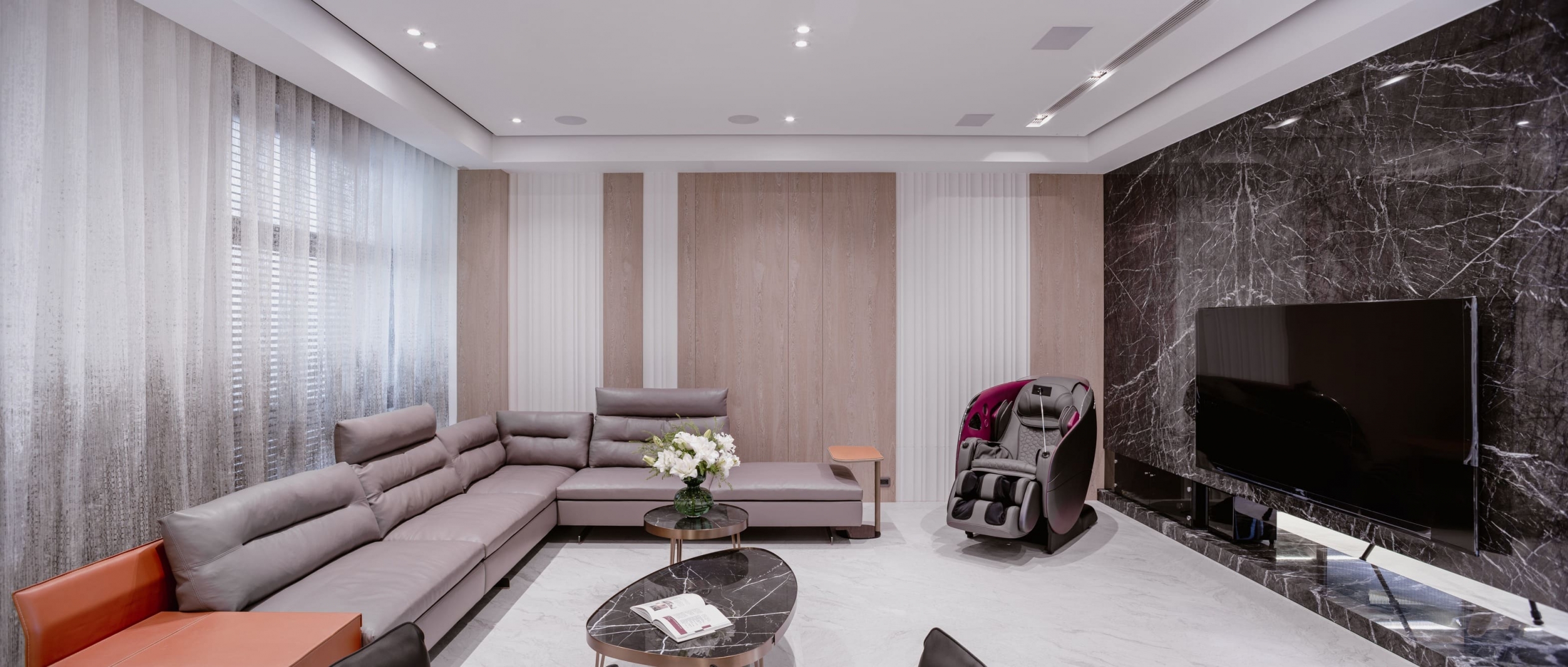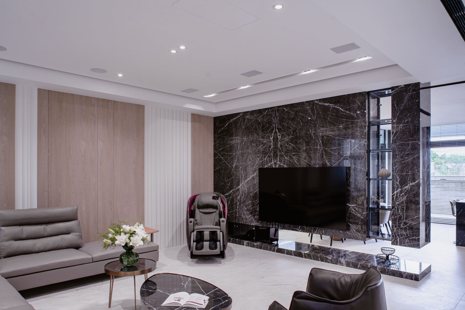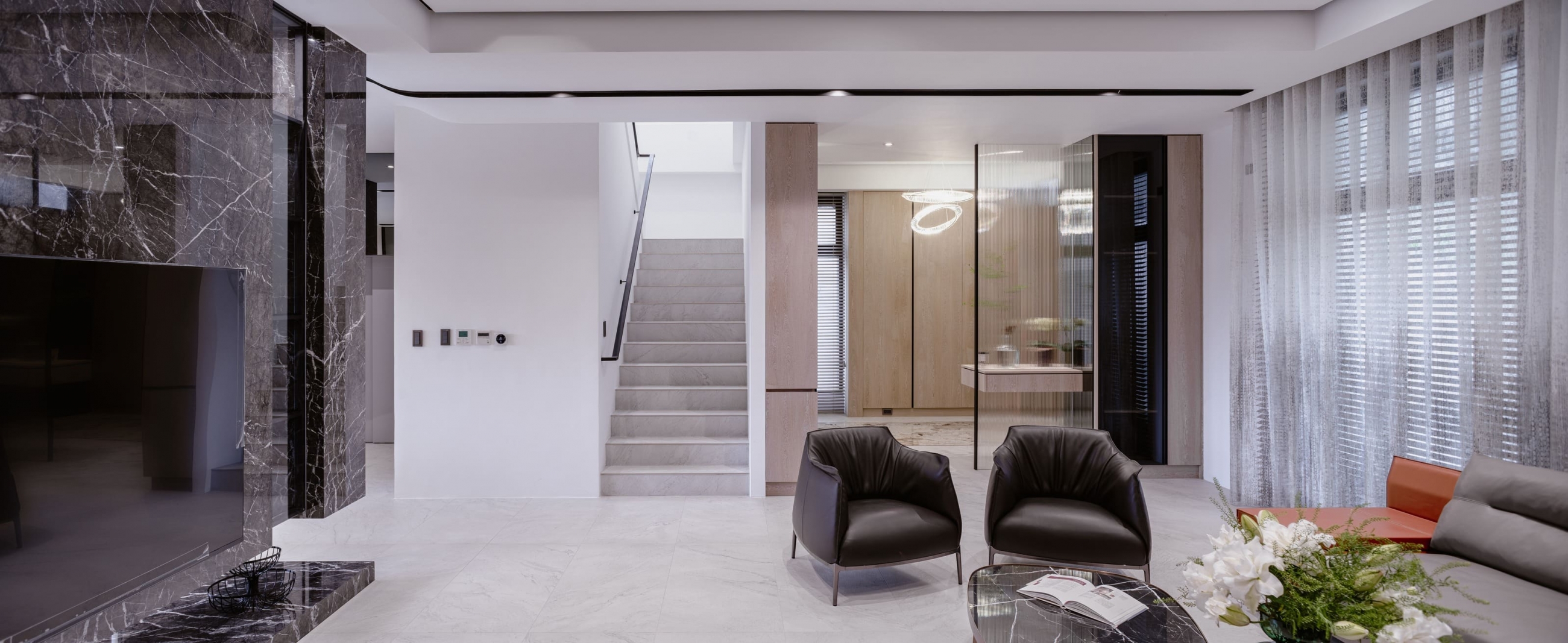 透過大片玻璃窗灑落的陽光,使客廳溫暖且明亮,家庭成員可在此輕鬆愜意地分享喜怒哀樂,一同度過珍貴的時光。