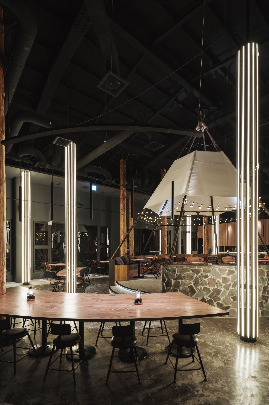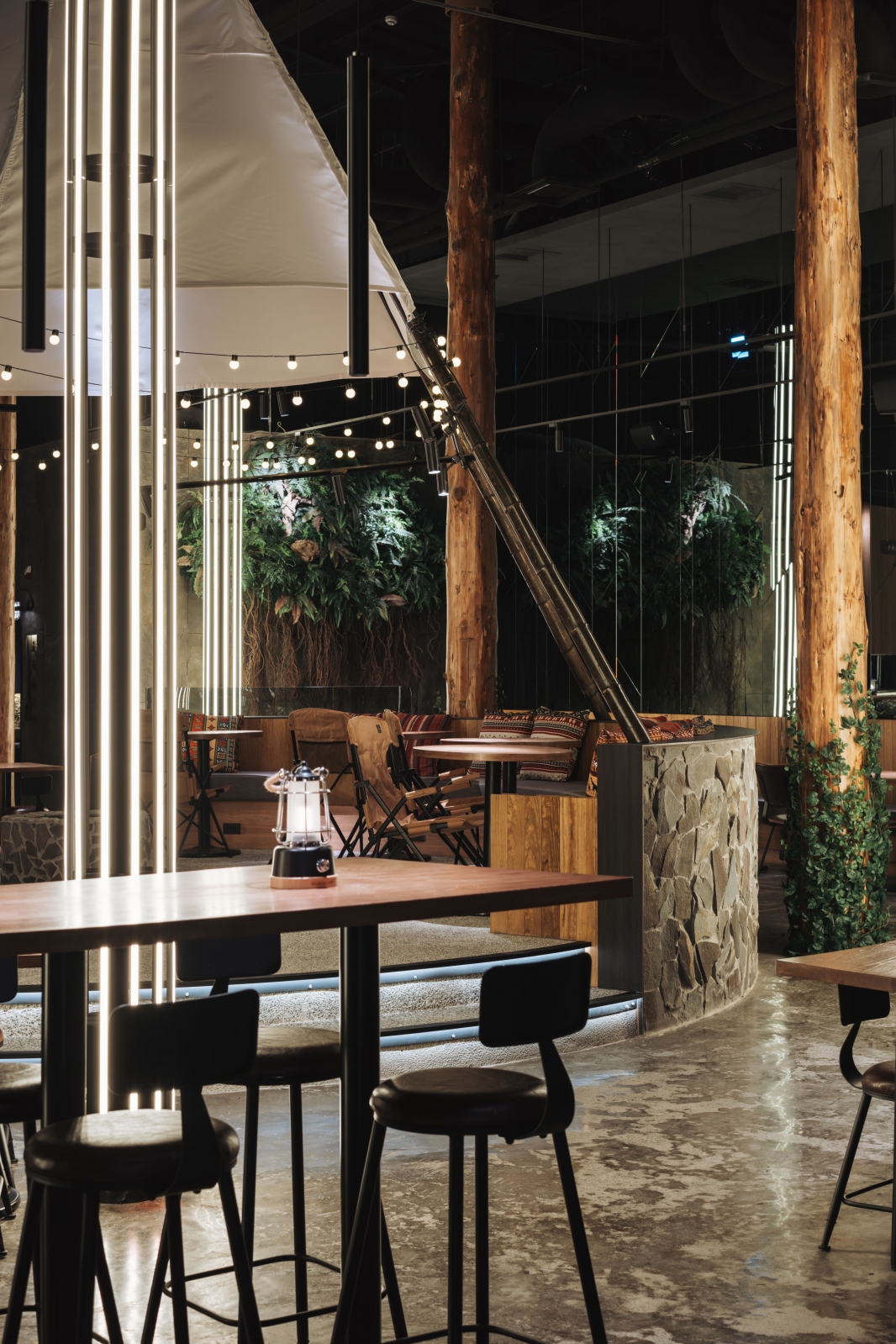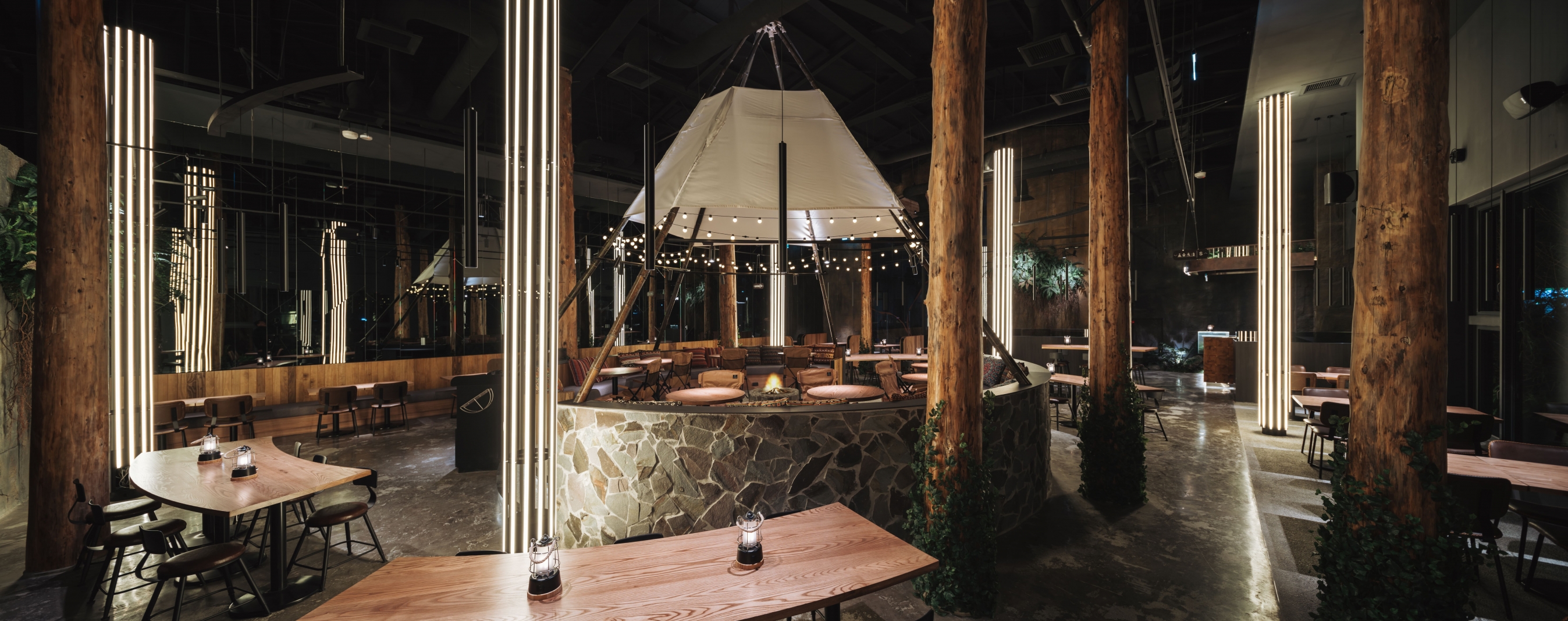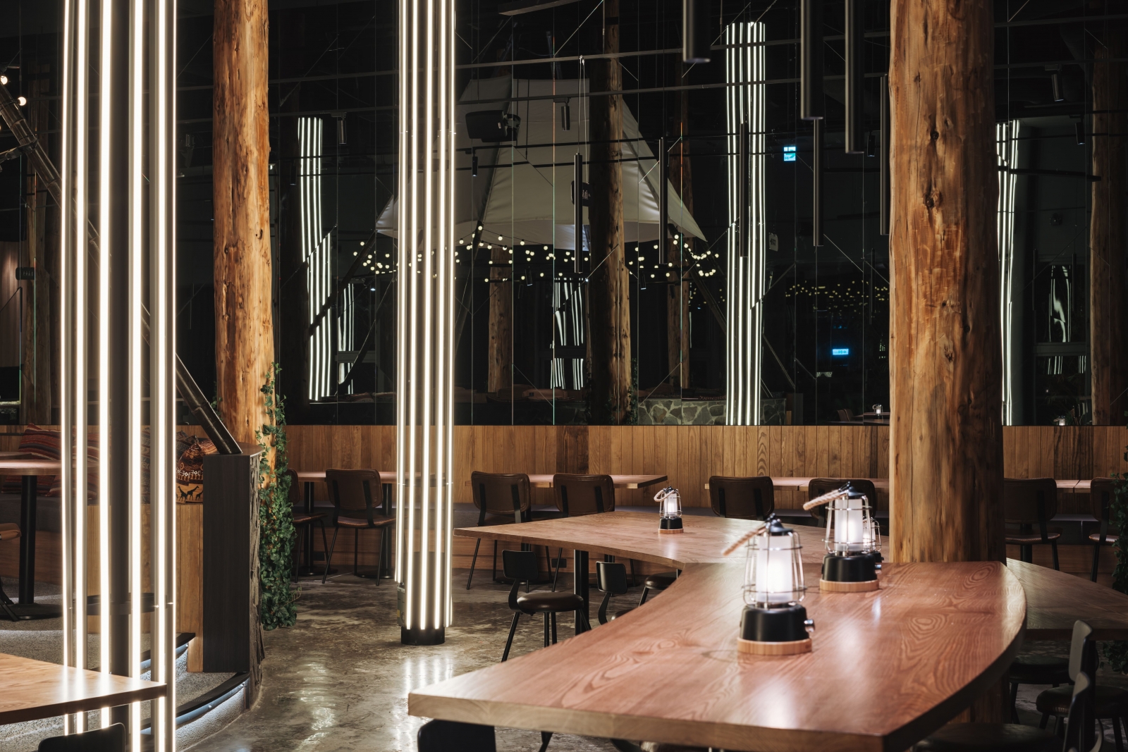 室內林立著大型樹木,透過大面鏡面材質反射真實樹幹的倒影,彷彿森林圍繞,中間的圓形架高帳篷區為這次最主要的視覺中心,帳篷內的壁爐為空間增添了溫暖的氣息。