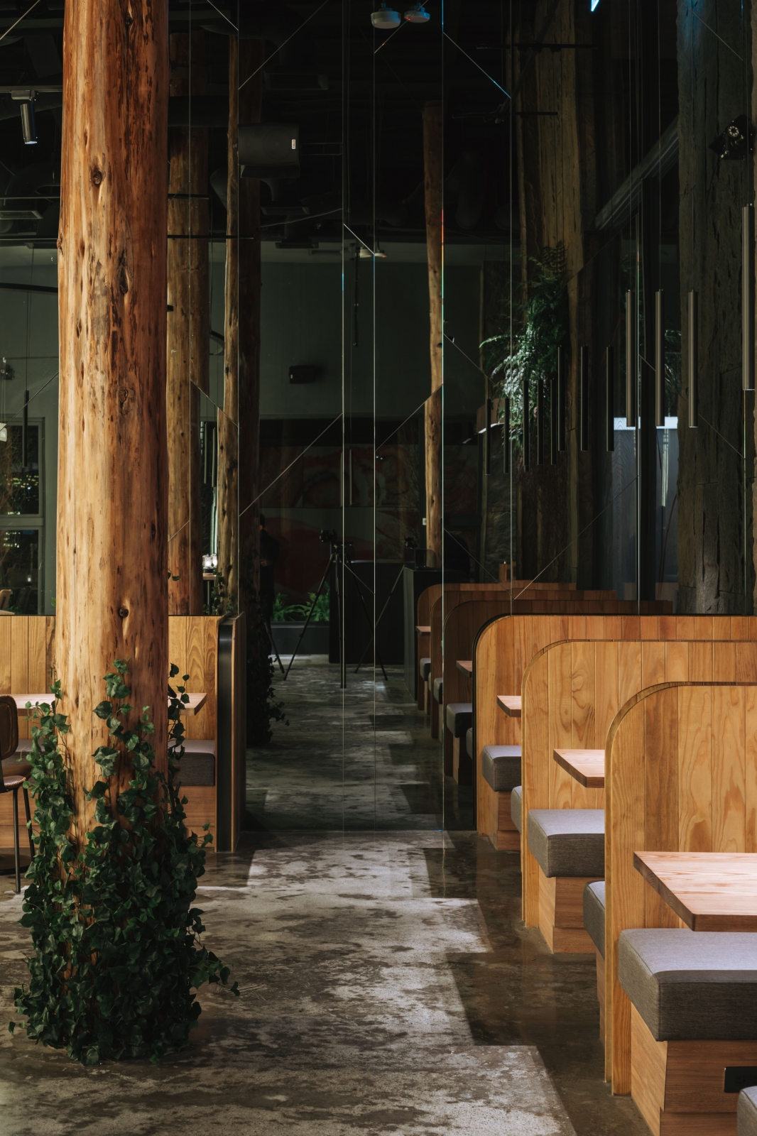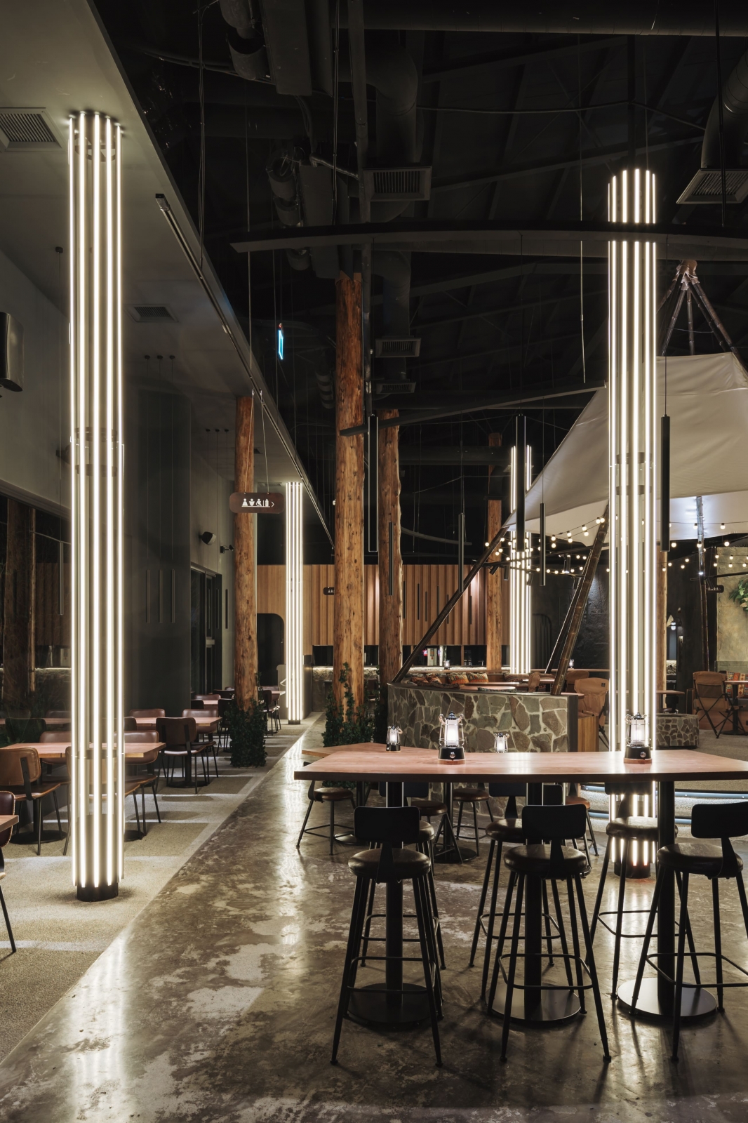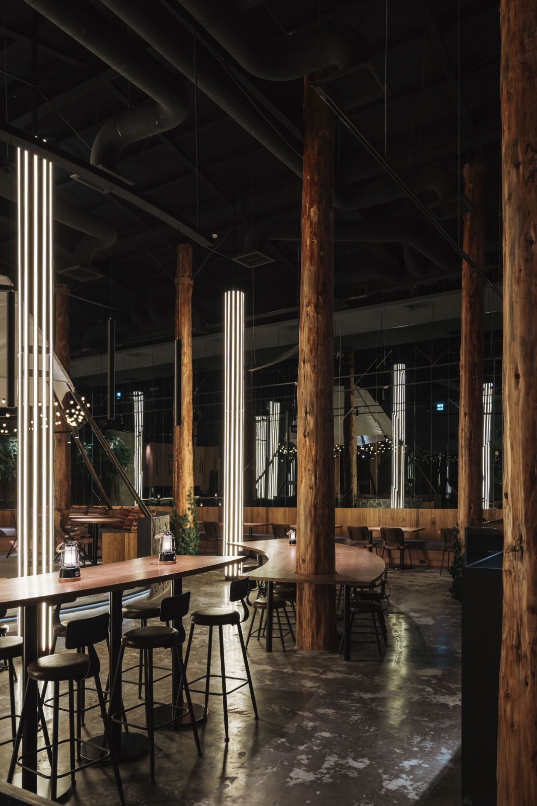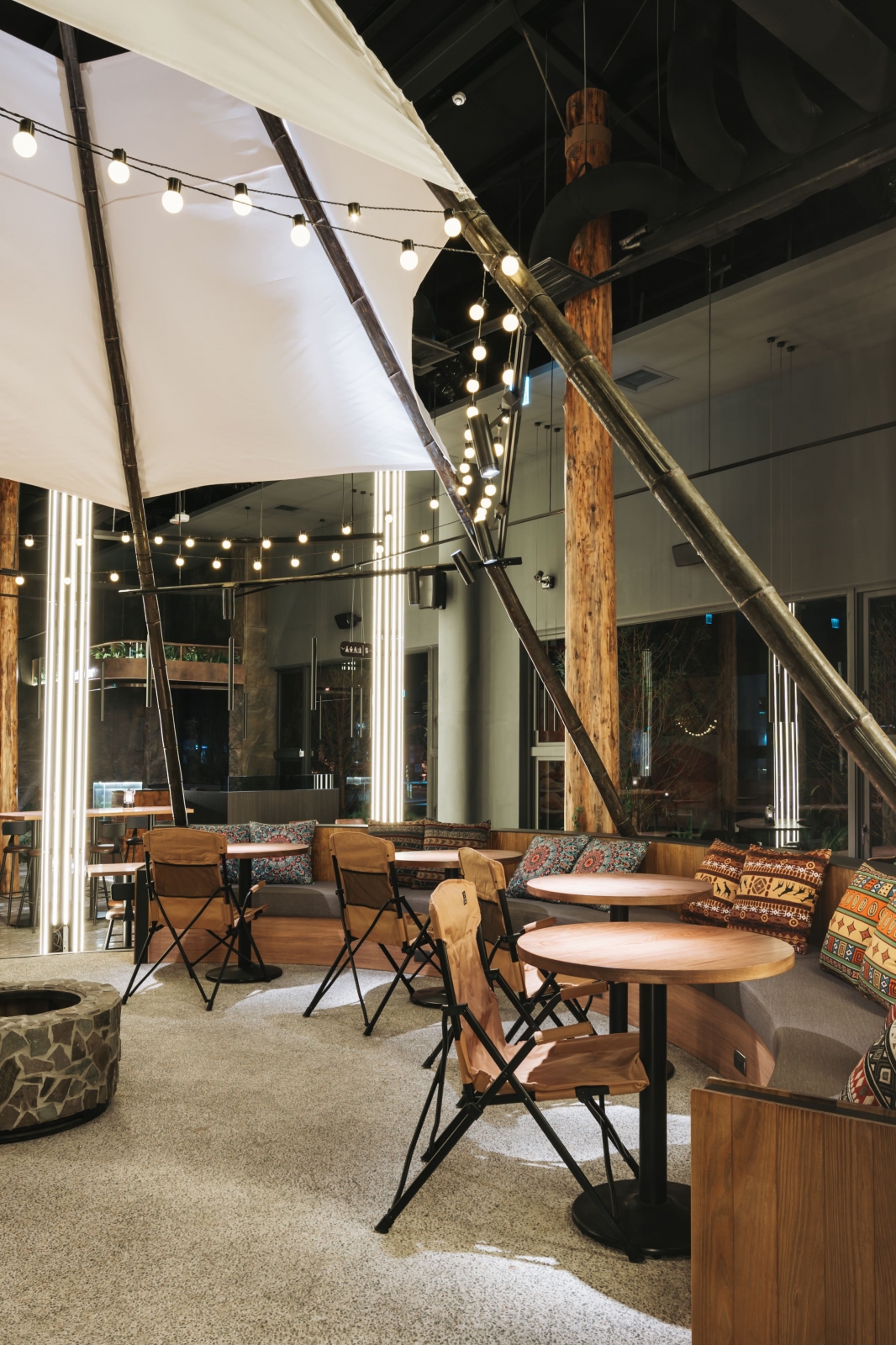 室內林立著大型樹木,透過大面鏡面材質反射真實樹幹的倒影,彷彿森林圍繞,中間的圓形架高帳篷區為這次最主要的視覺中心,帳篷內的壁爐為空間增添了溫暖的氣息。