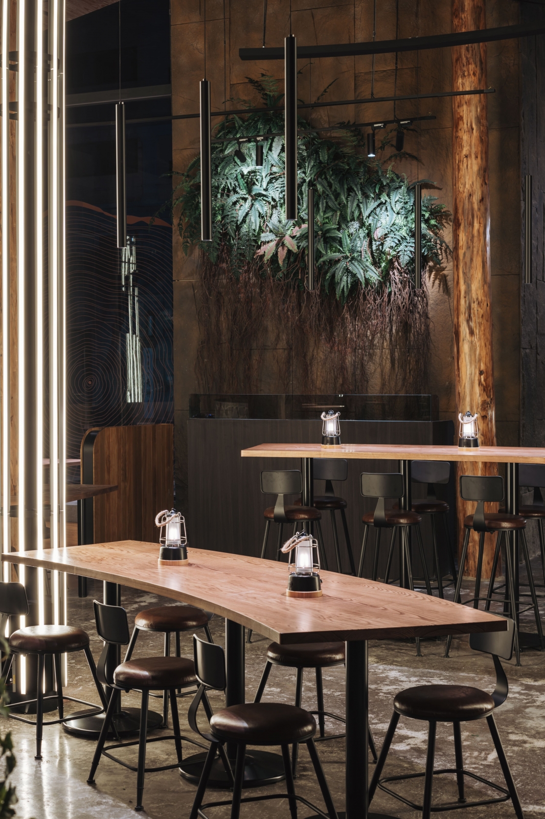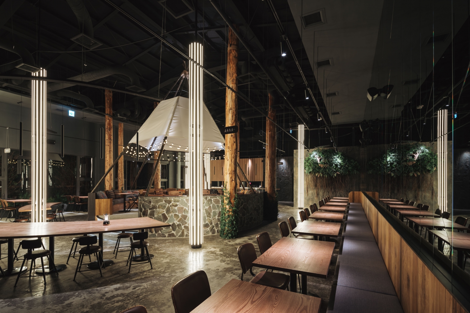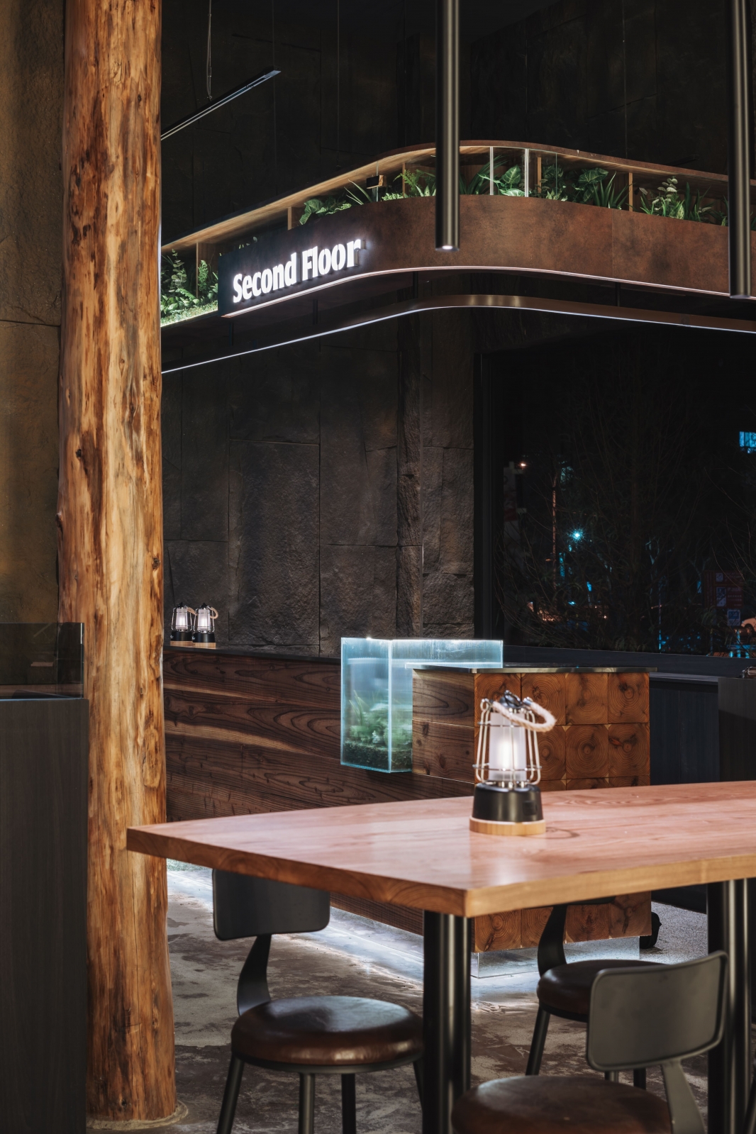此外,仿樹幹的現代燈柱彷彿在呼吸般,隨時間忽明忽暗跳動著,而周圍的牆面以仿岩石製造山穴岩壁的粗糙感,自然融合現代的設計,以及局部氛圍點亮的燈光,製造像是在營區的點點星光。