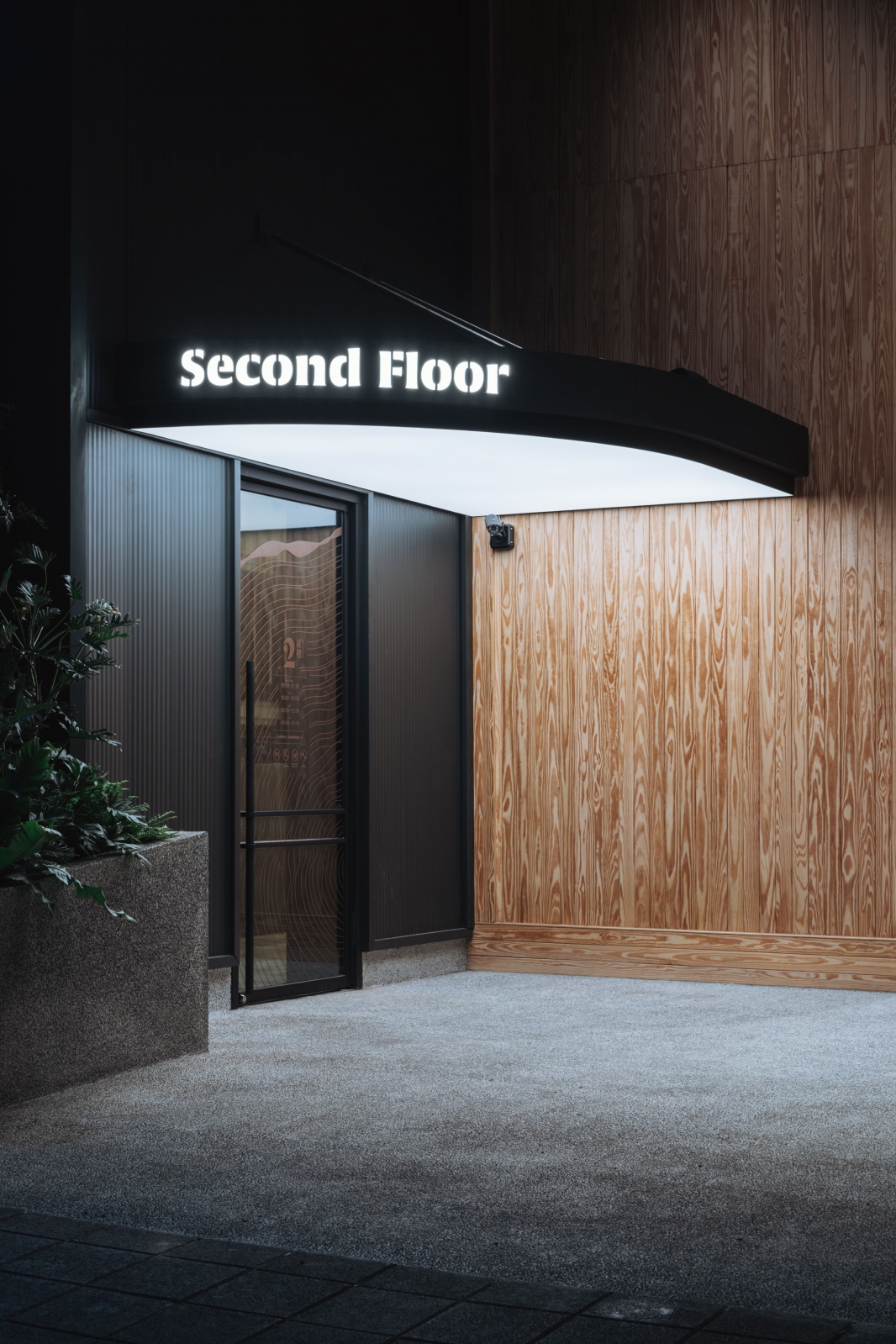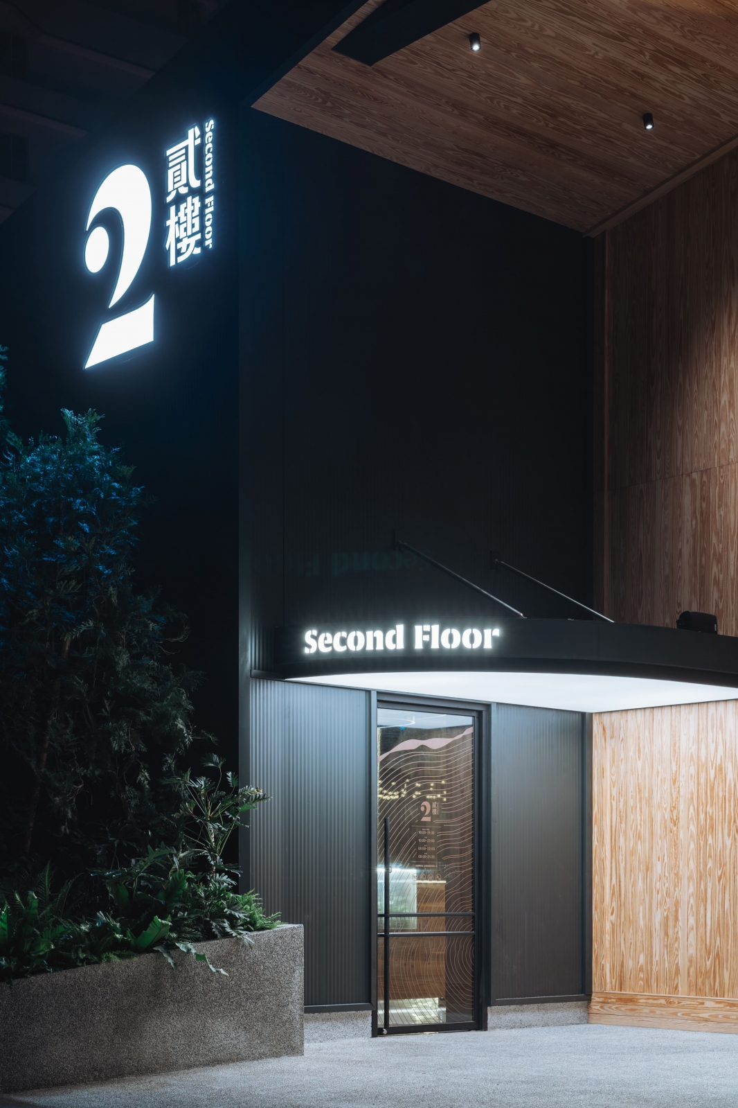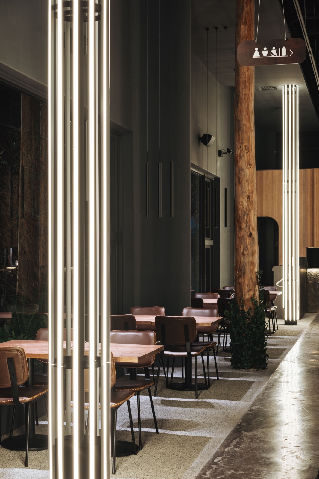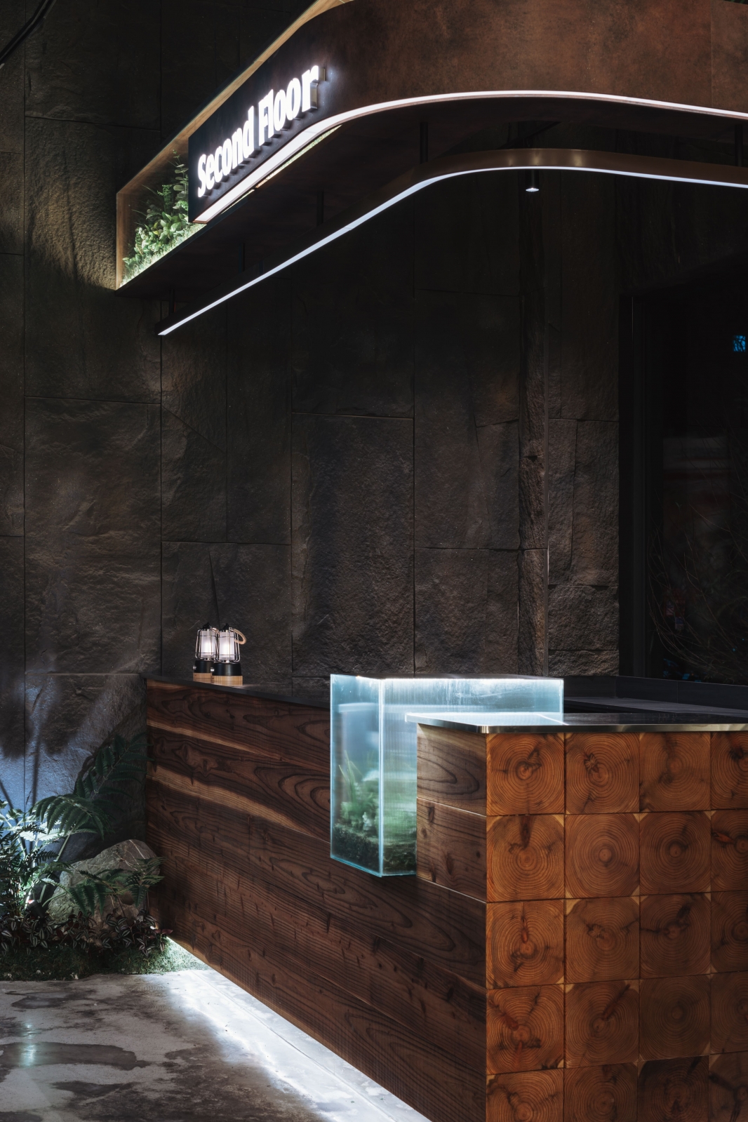 此外,仿樹幹的現代燈柱彷彿在呼吸般,隨時間忽明忽暗跳動著,而周圍的牆面以仿岩石製造山穴岩壁的粗糙感,自然融合現代的設計,以及局部氛圍點亮的燈光,製造像是在營區的點點星光。