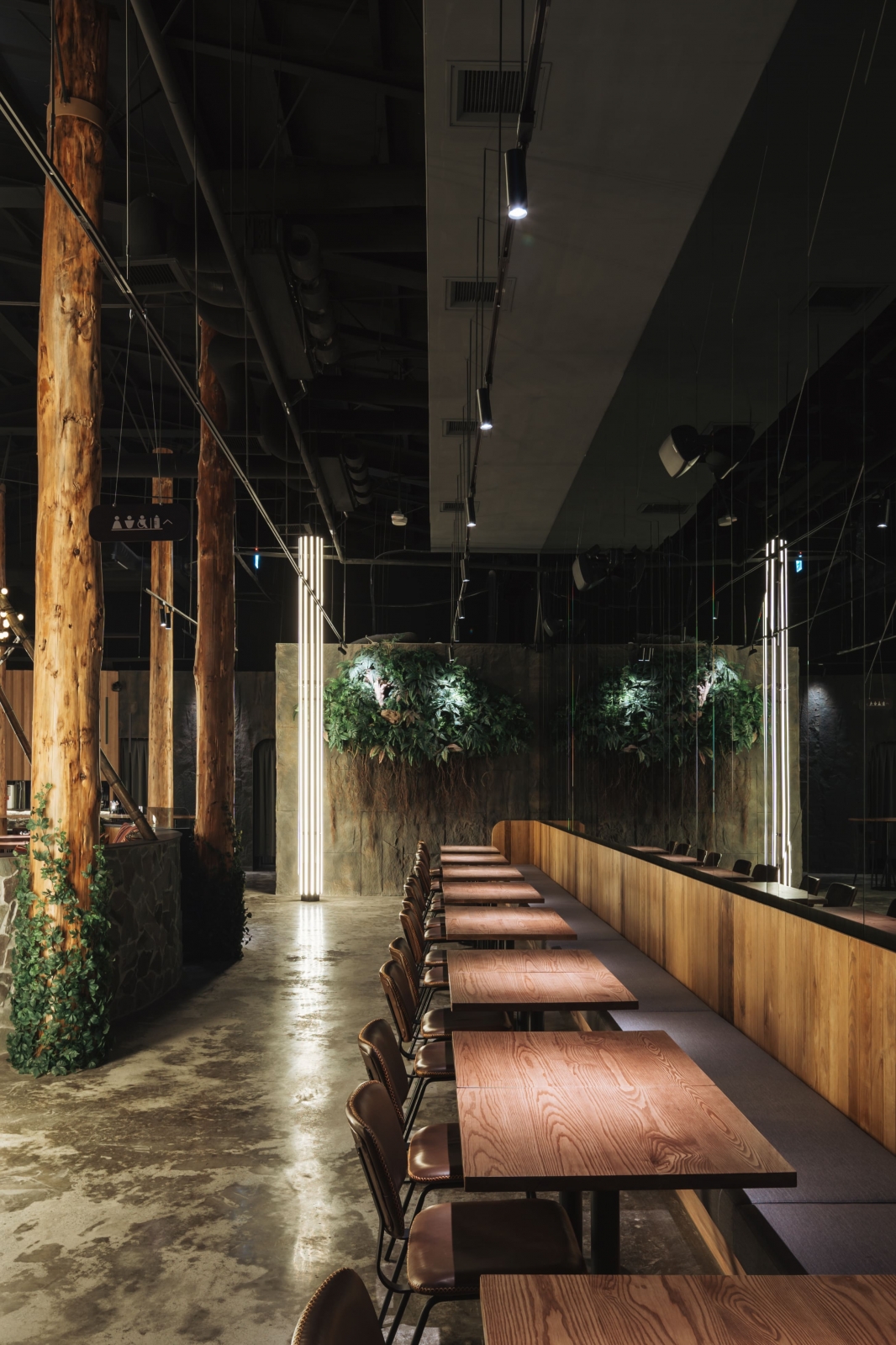 現場使用的原木柱體、仿岩石的牆面,彷彿置身於森林裡
