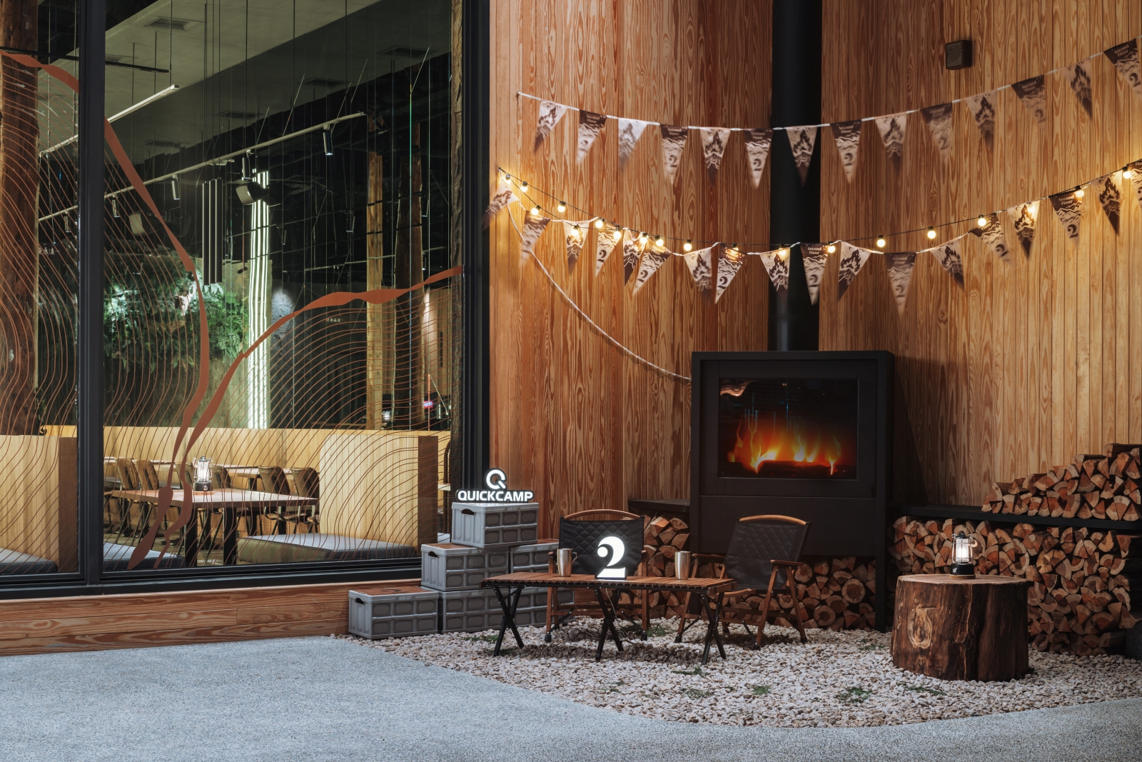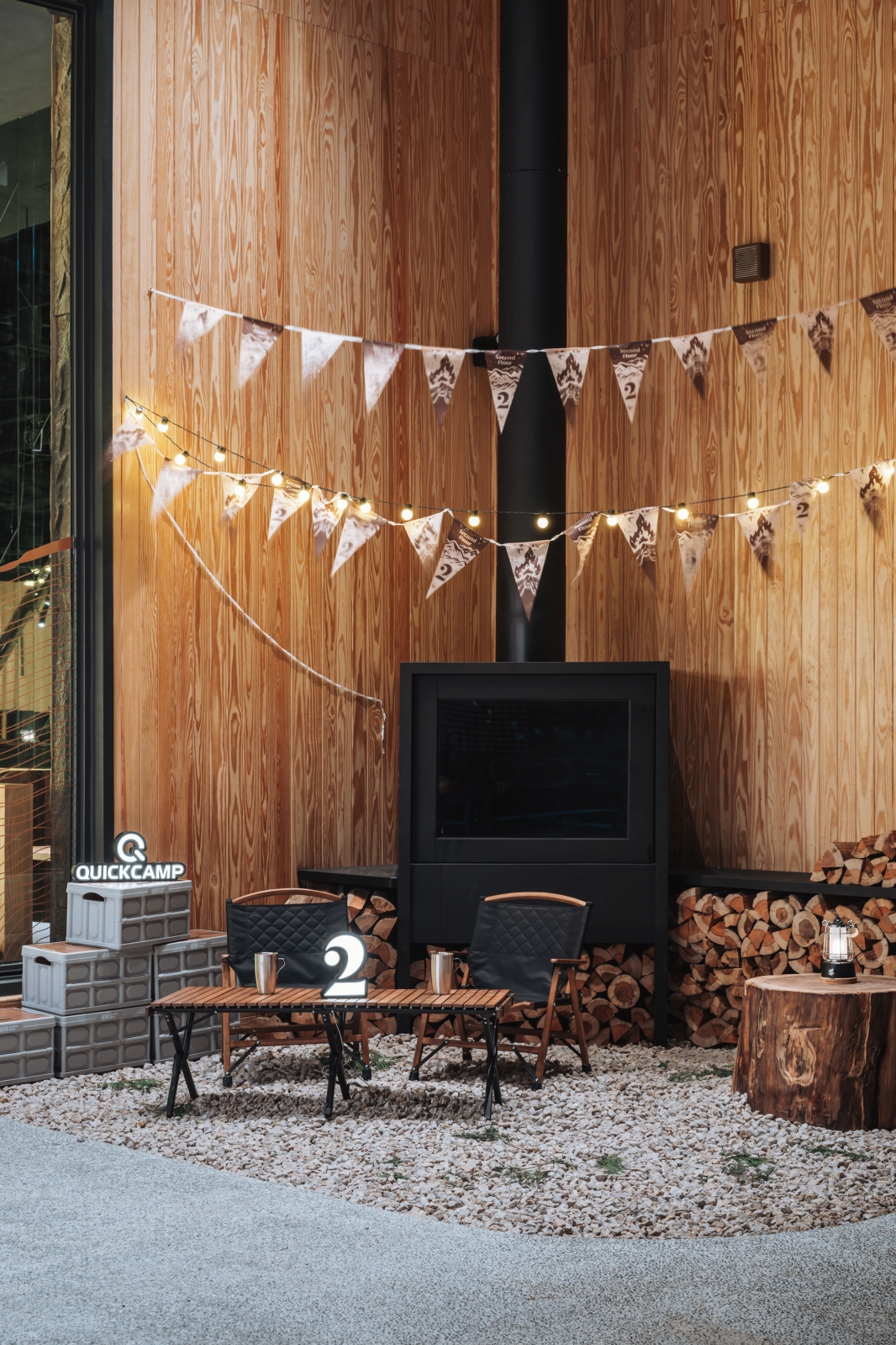 踏進入口處的打卡點,擺設的露營用品、壁爐和柴火堆疊出濃厚的露營氛圍。