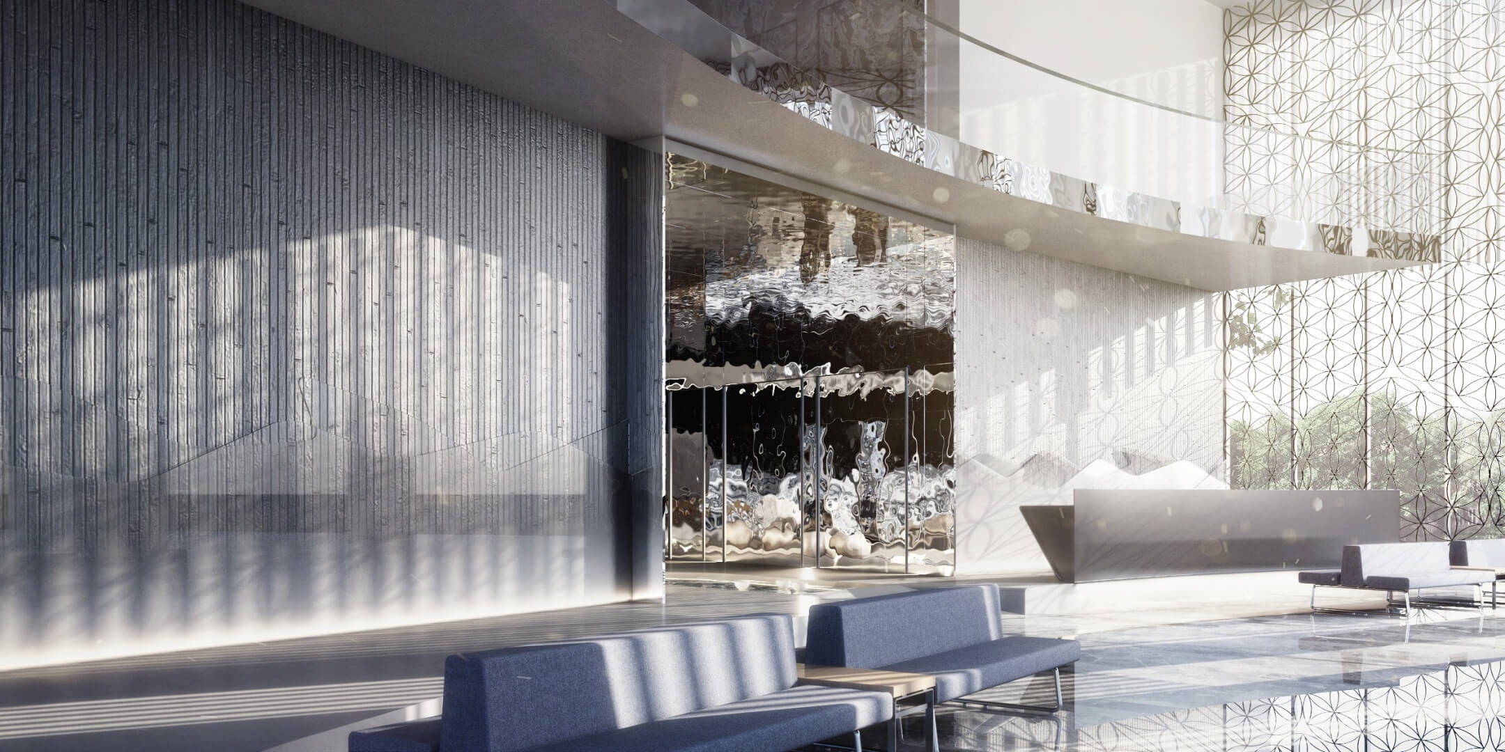 整體設計從高雄海港出發,不是那種明亮清透的海,而是以「深海洋」為主軸,深藍、靜謐,帶點神祕感。像是潛進海底洞穴,沒有刺眼的光,只有藍色波紋在空間裡緩緩流動。