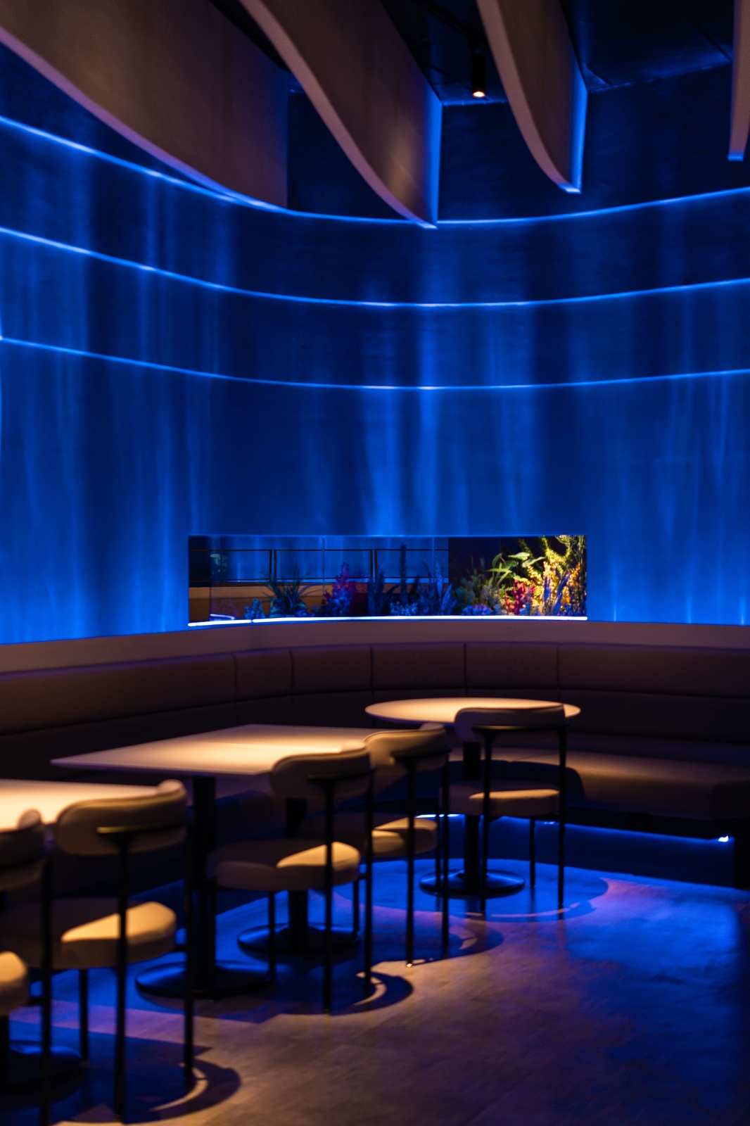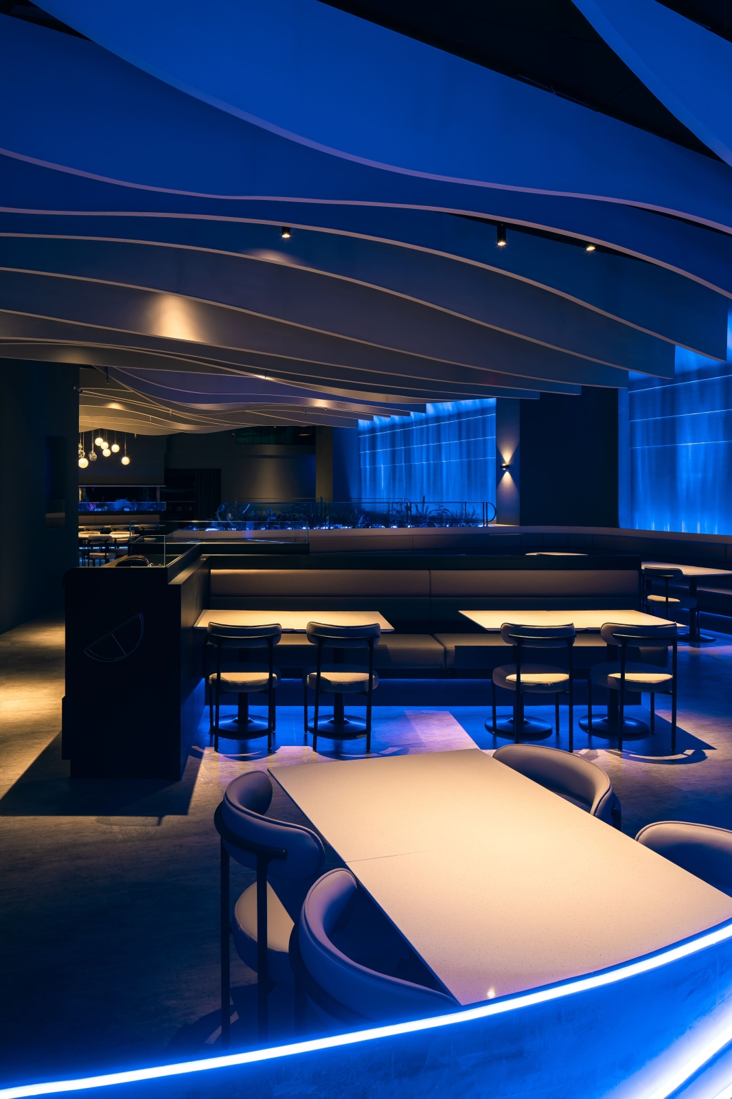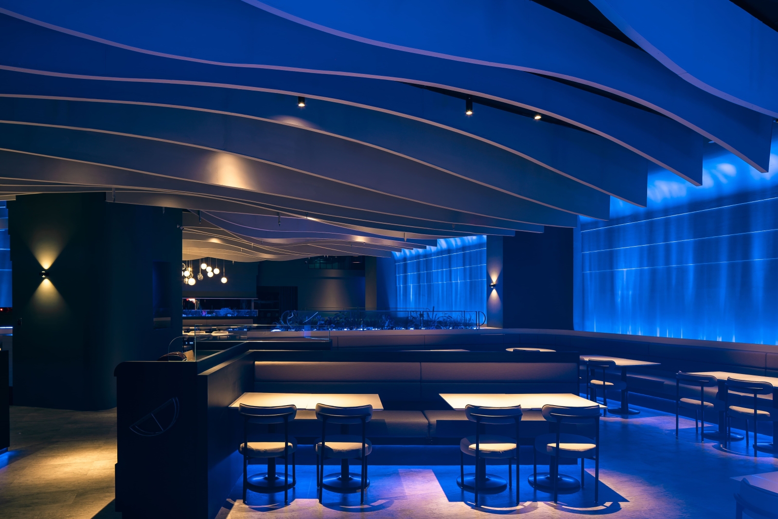 走進室內,每一區的天花板皆以波浪造型呈現,像是從海底往上望見的水面。牆上打著水波紋燈光,卡座底部藏有深藍燈帶,營造包覆感與節奏感,讓人在這裡自然慢下來。