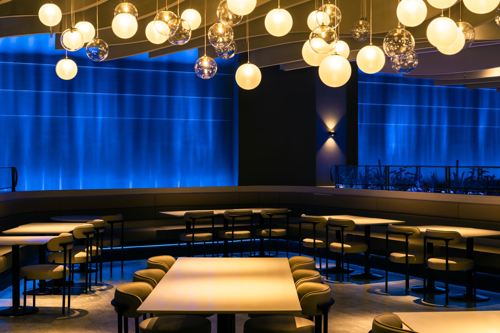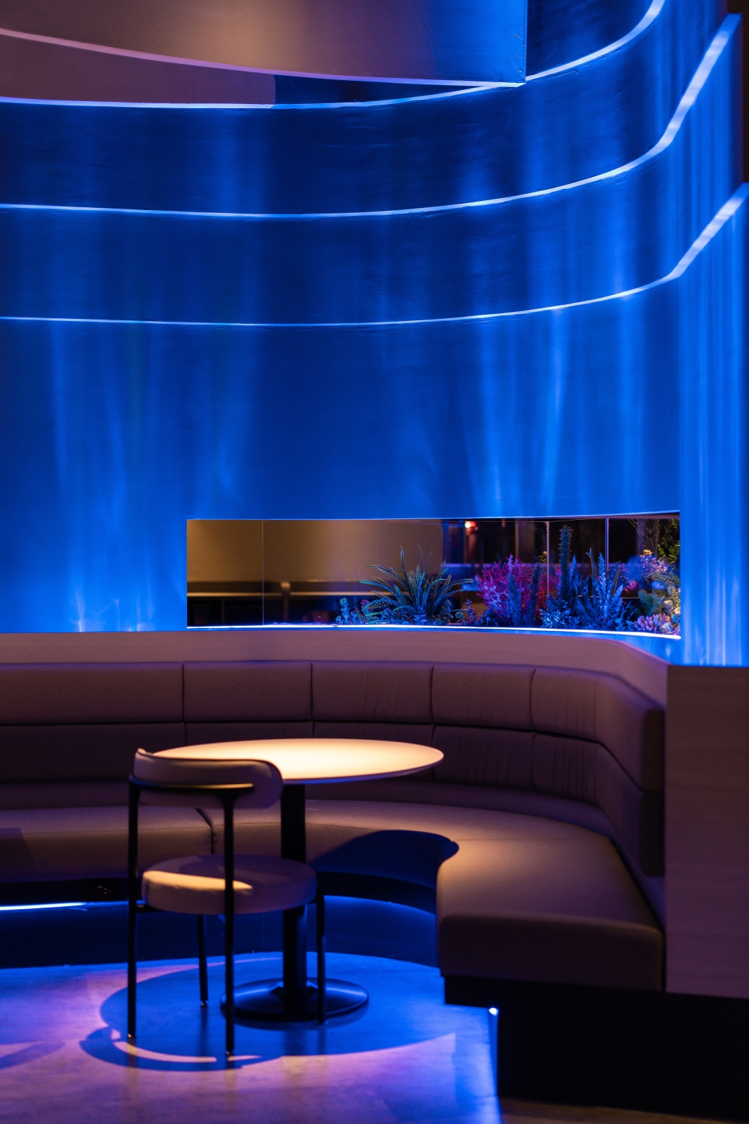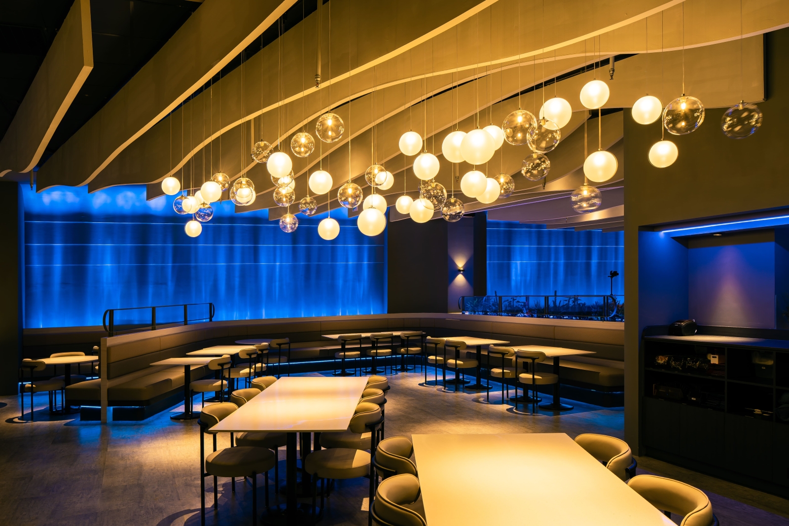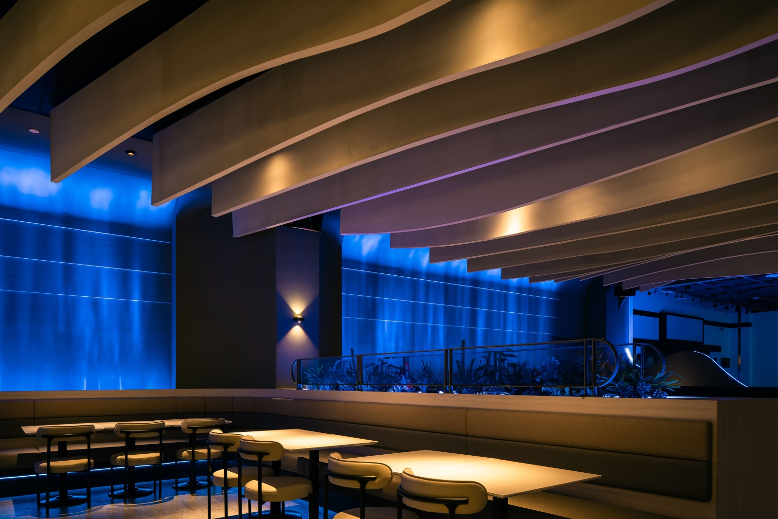走進室內,每一區的天花板皆以波浪造型呈現,像是從海底往上望見的水面。牆上打著水波紋燈光,卡座底部藏有深藍燈帶,營造包覆感與節奏感,讓人在這裡自然慢下來。