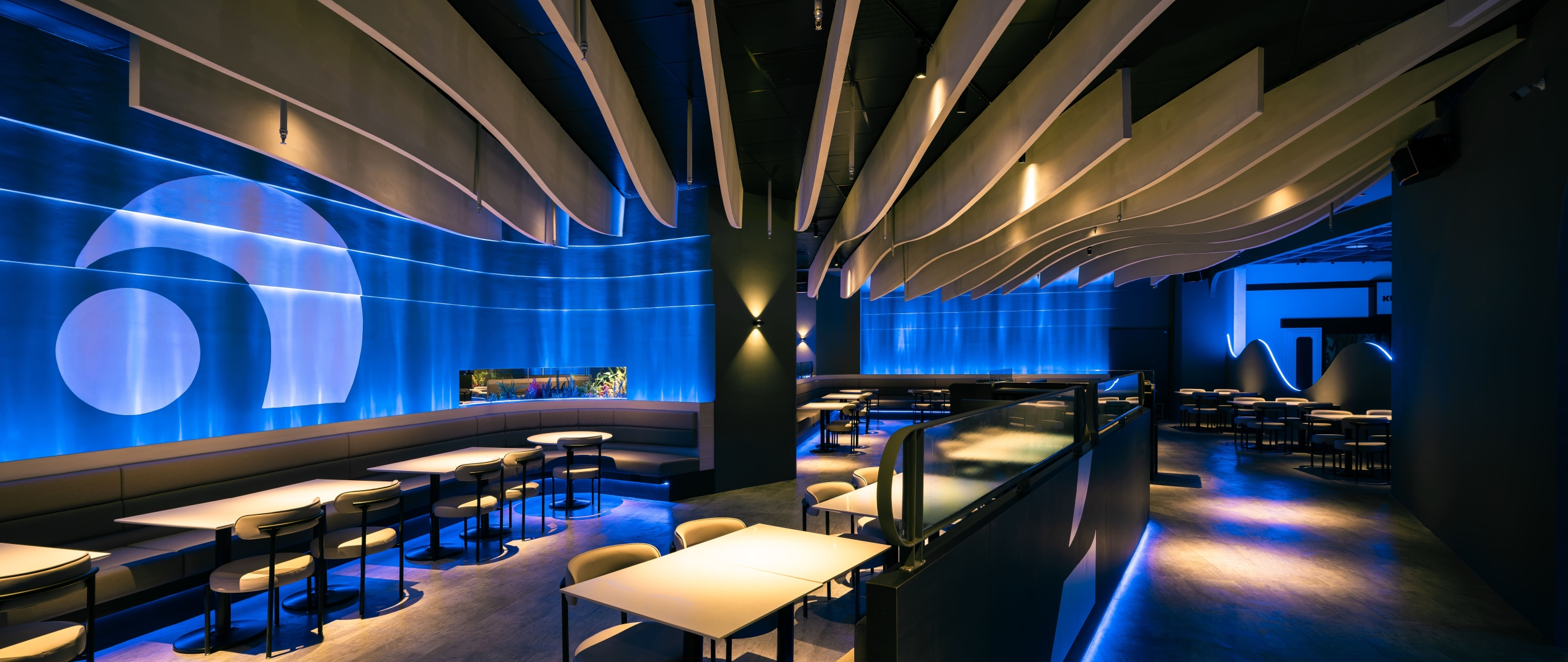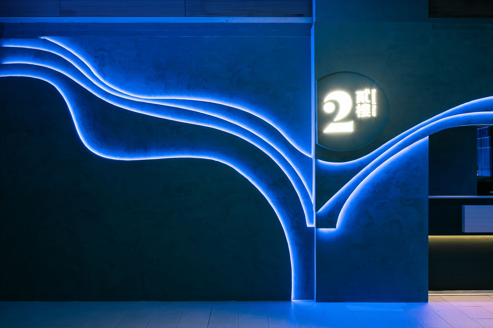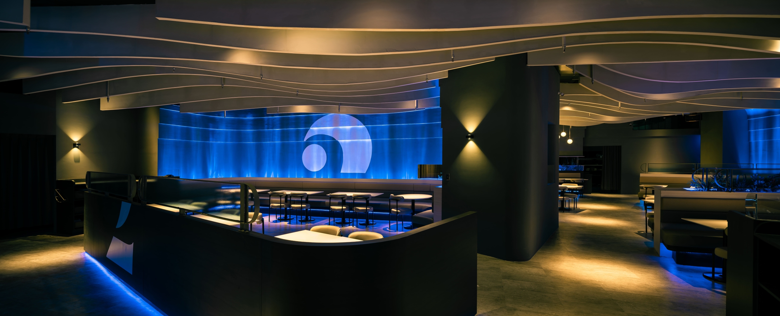 入口三層藍光曲線,像潛入海底洞穴,一眼就被記住 中央的數字「2」用透視錯位成像,像深海的定位光源,波浪天花一路延伸,牆面水紋與卡座深藍光帶,包覆整個感官,錯落座位,就像在礁岩間安靜的棲息。