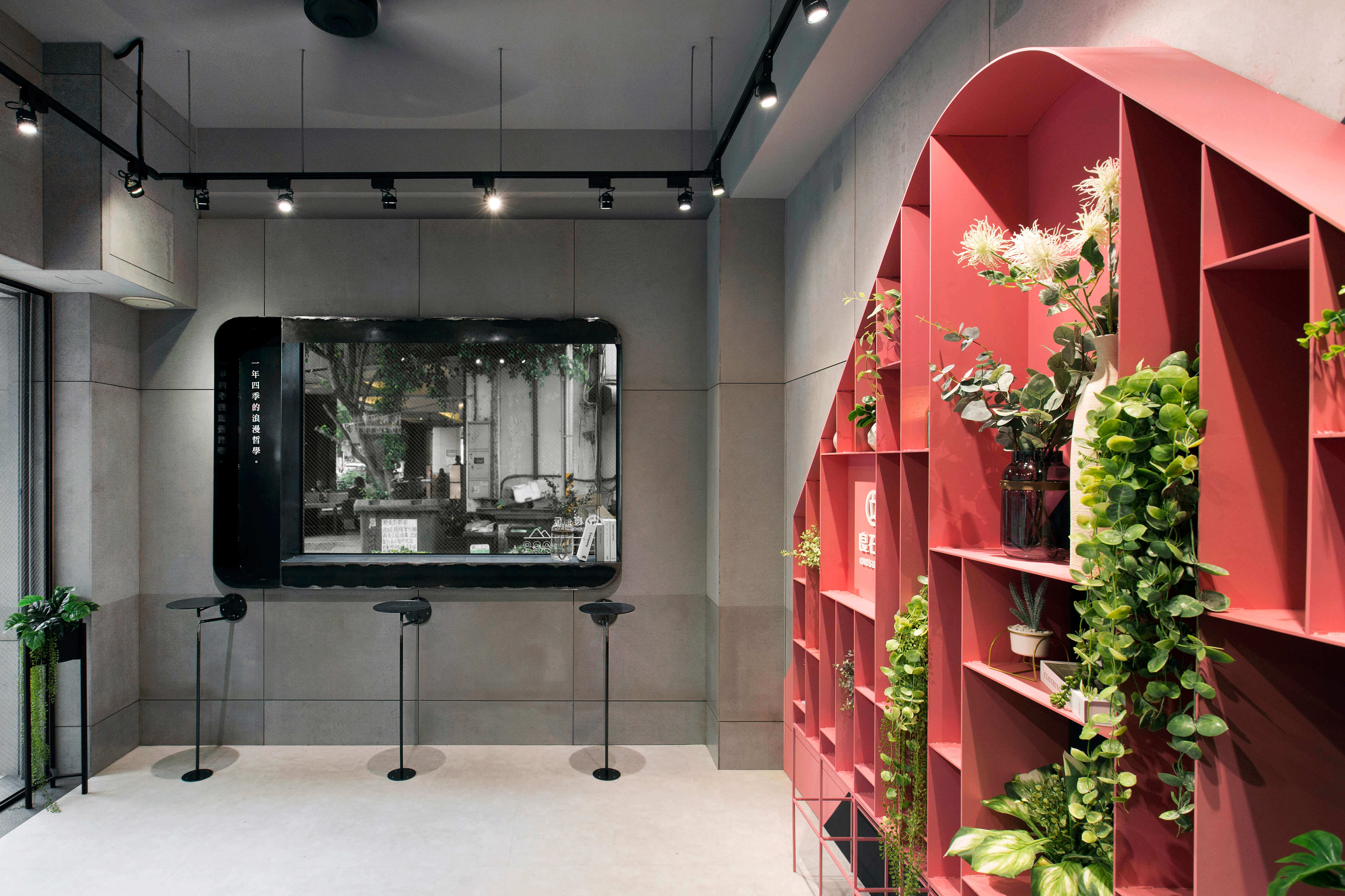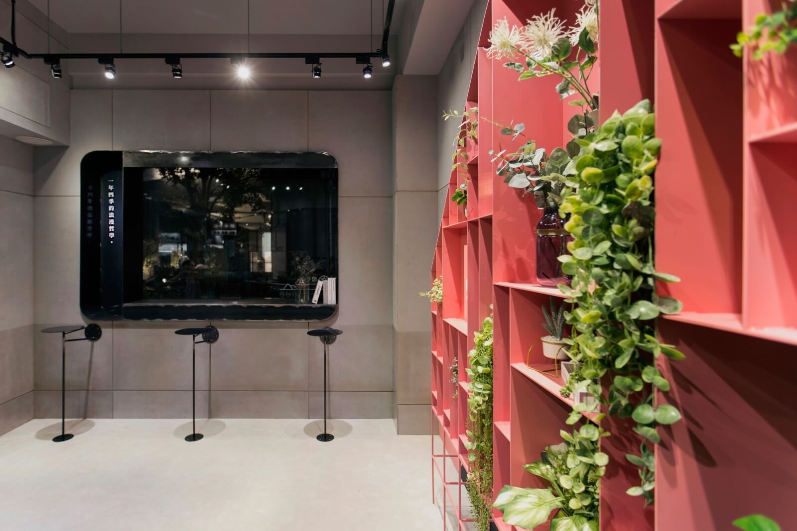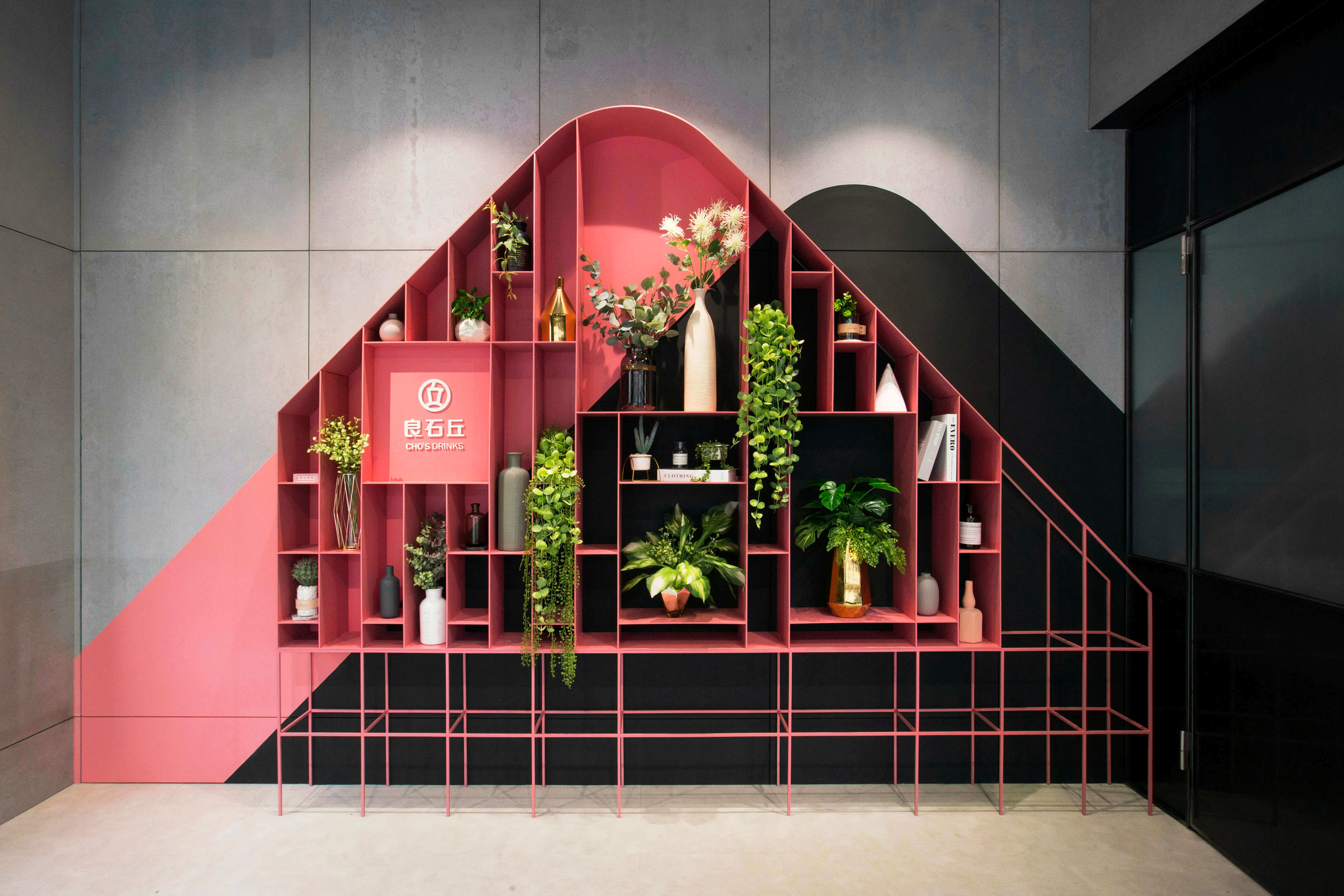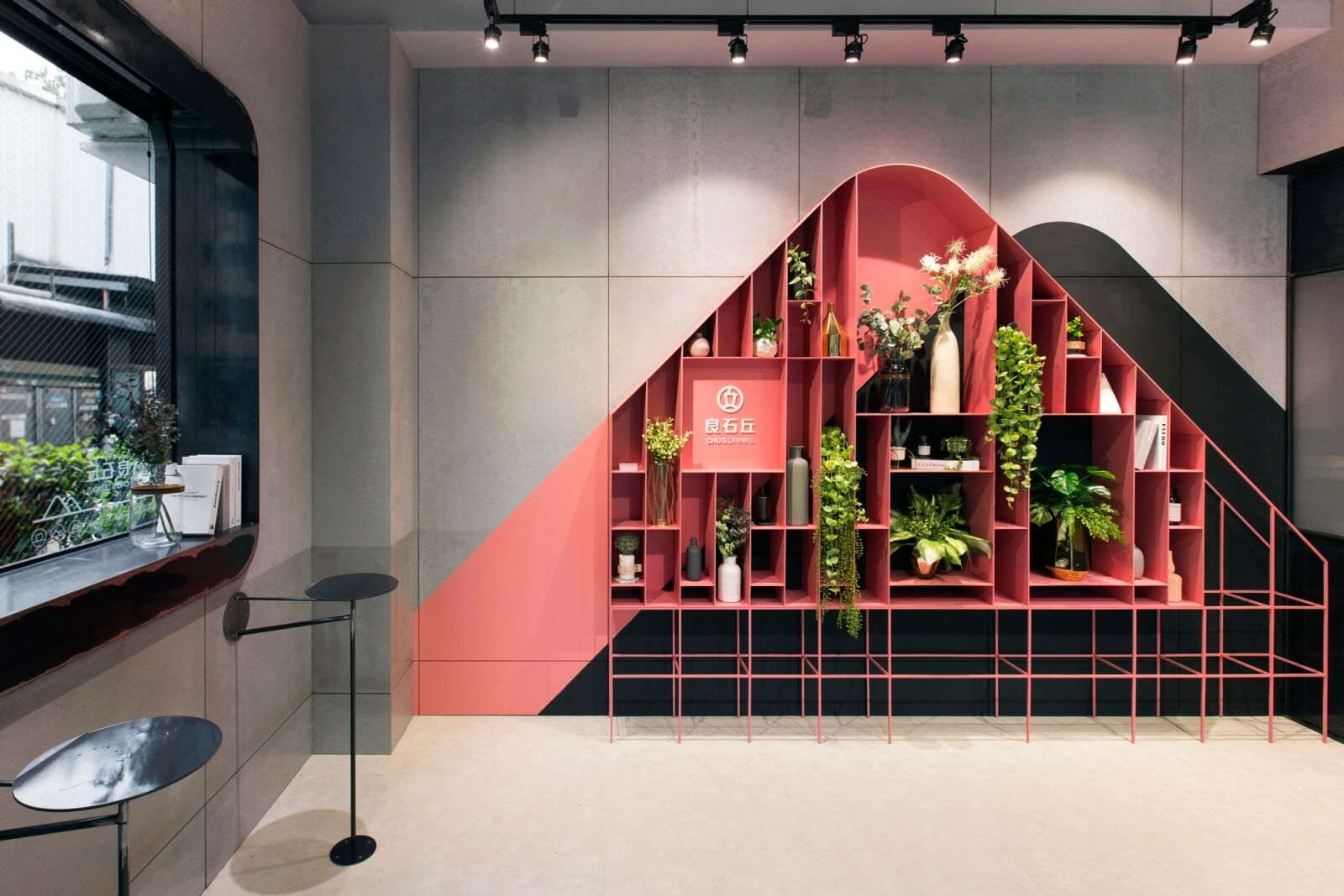在上述提到的牆面山形櫃,就是良石丘店裡的重頭戲,良石丘的「丘」,主要為山的形象。我們將展示需求結合牆面和櫃體,並以山的意象為主軸。在一進門時,迎來的即是粉色醒目的山形櫃,一片粉紅裡搭配些許植物點綴,再拉遠看,空間裡的灰色調有著粉嫩與青綠的調和,加強人們