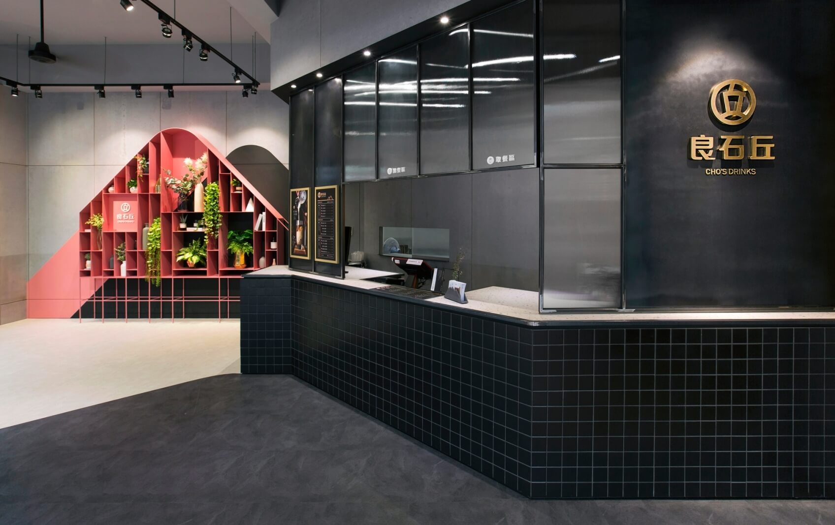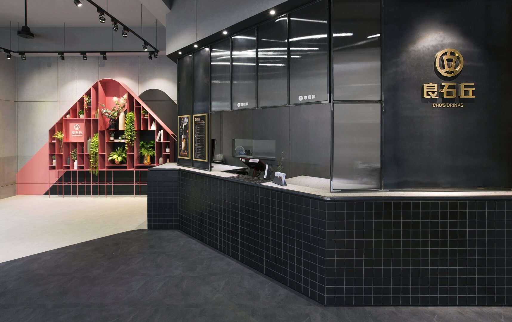 結合業主的訴求,我們利用品牌主視覺的兩個顏色「灰色、粉色」搭配,以灰黑色為空間主題色,而粉紅色則作為點亮空間、增加暖度的要素。