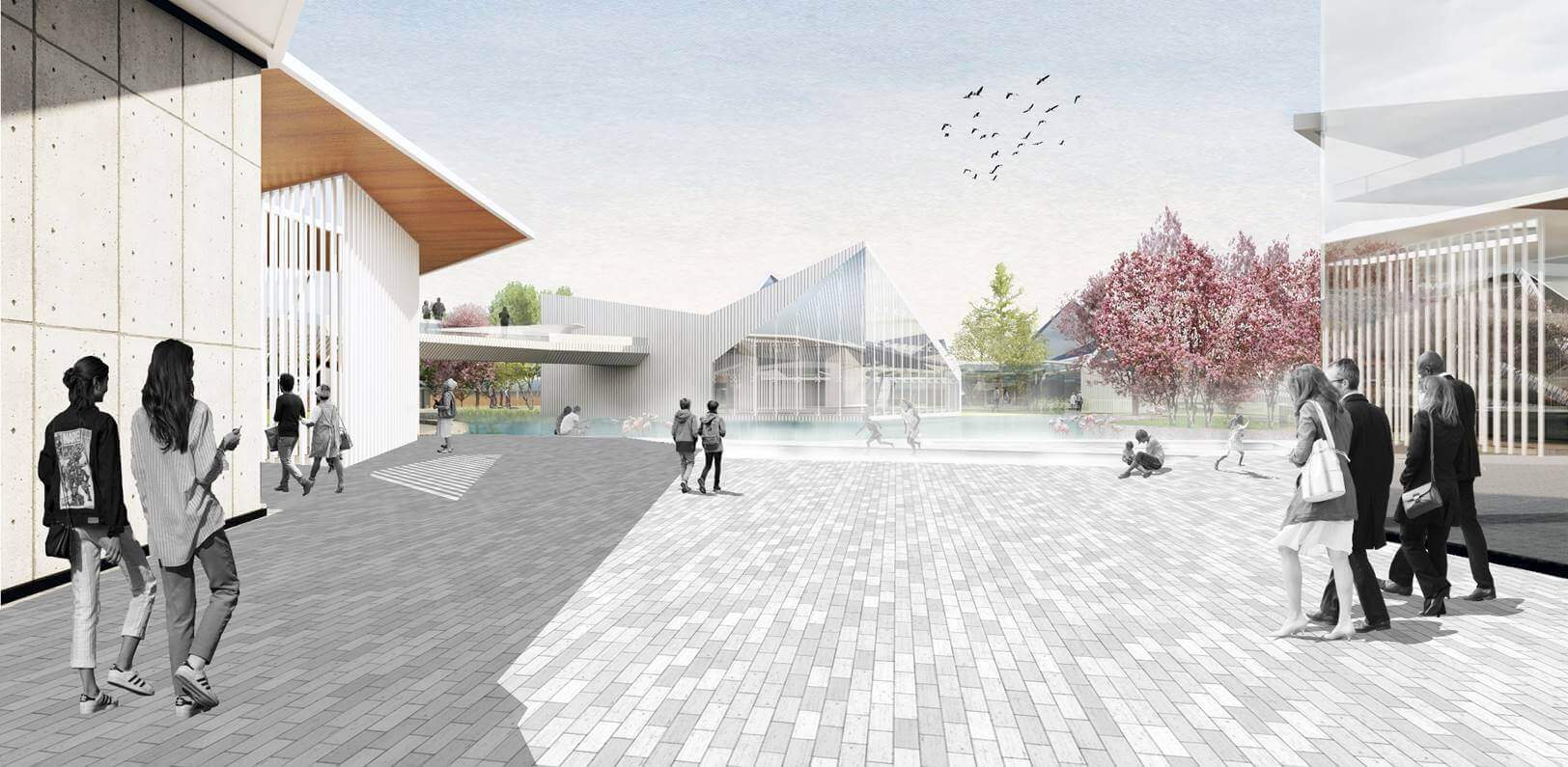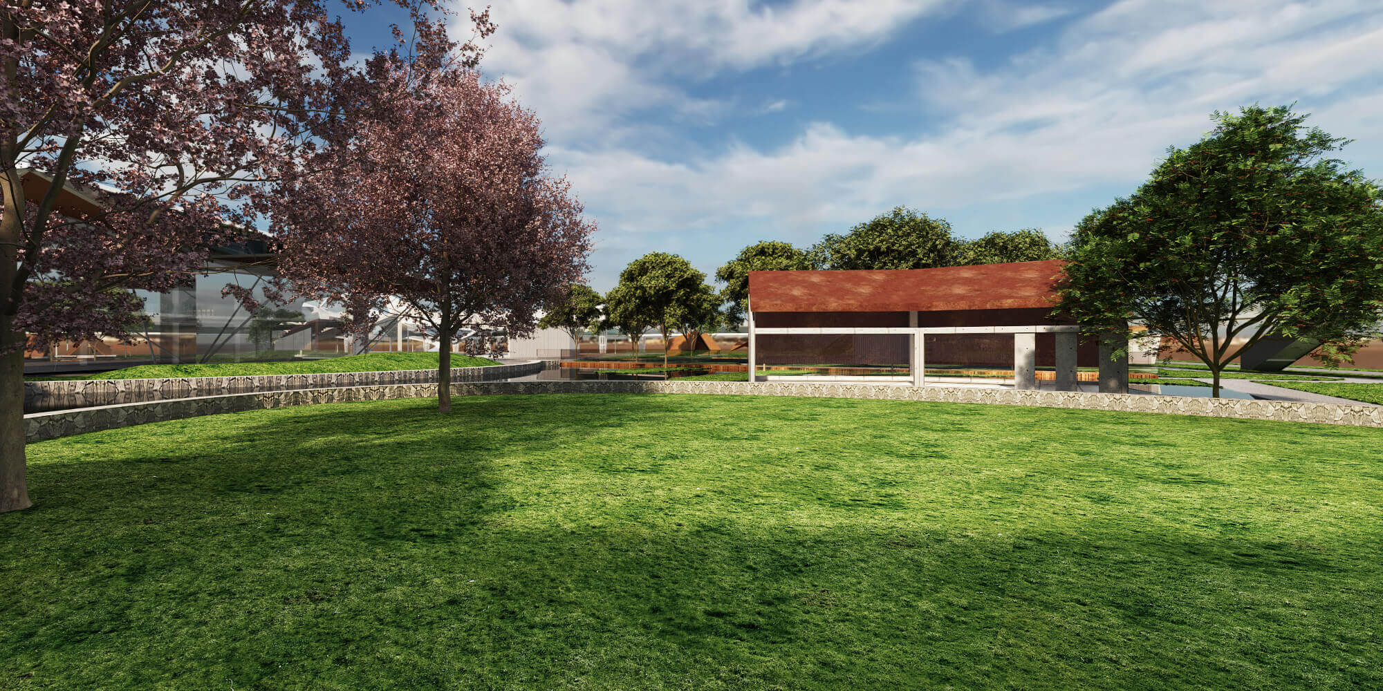 而這邊的景觀設計概念是以中央水體,整合空間並營造開闊感,連通南北向的視覺通透性。