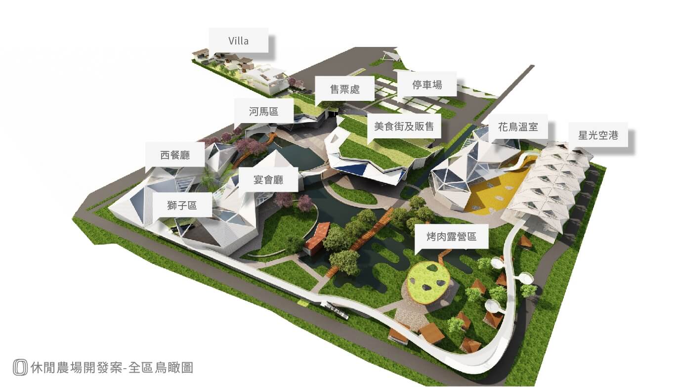 階段一:停車場、售票亭、行政管理中心、阿嬤ㄟ餐館、航廈館、複合西餐廳、宴會廳、動物園、景觀生態湖、天空綠廊、露天婚禮廣場。