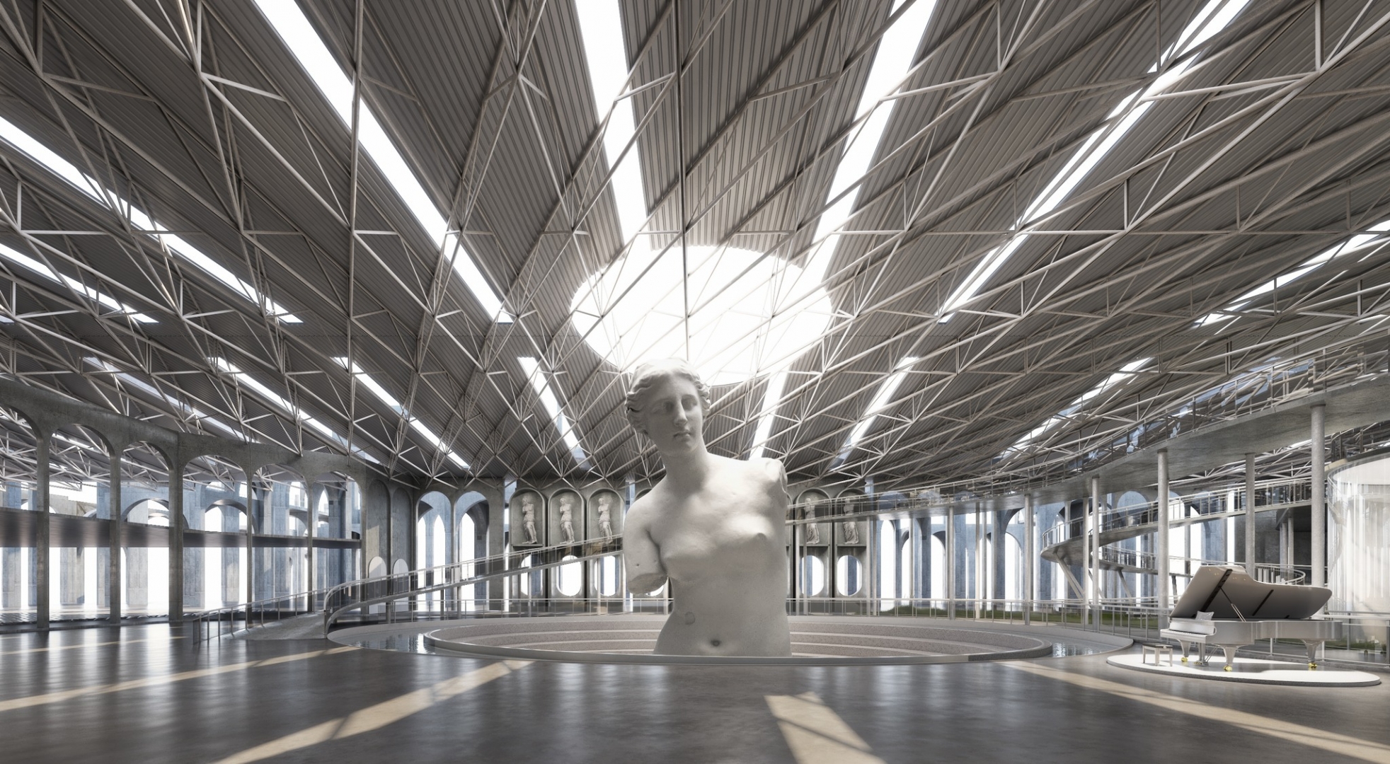 這樣的預設是:整條動線從入口開始,就讓建築呼應出自然地景,牆面採用斜面降低區隔感,也有迎接人們到來的意思。接著來到水霧廣場,我們以現代化風格處理這個區塊,白色的格柵與線條組成的量體,目的是讓消費者感到心曠神怡。